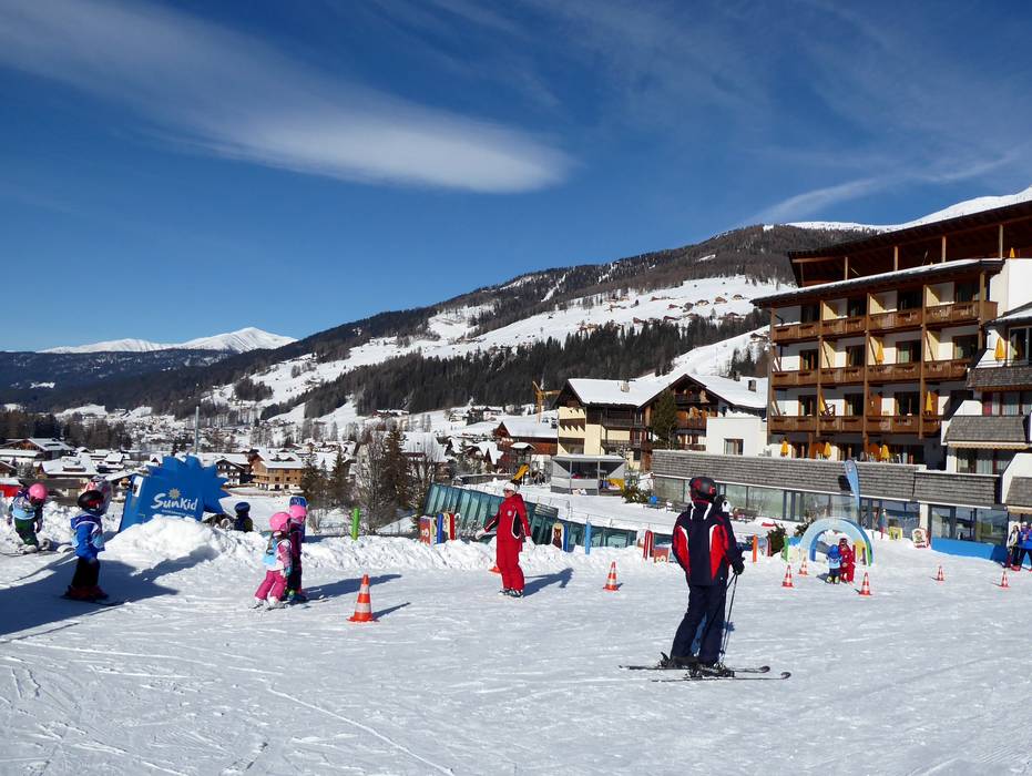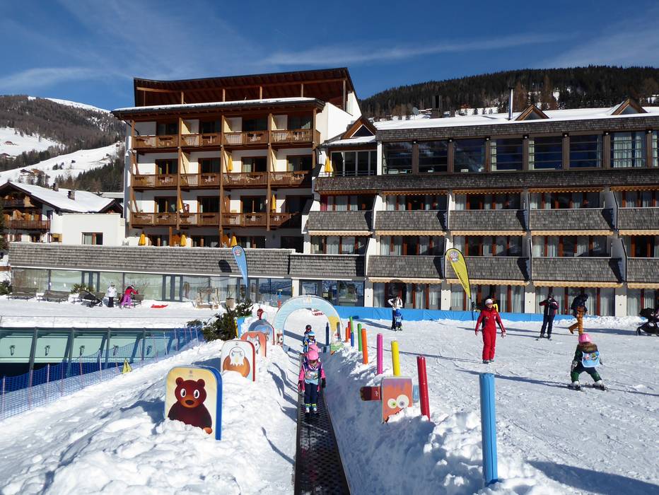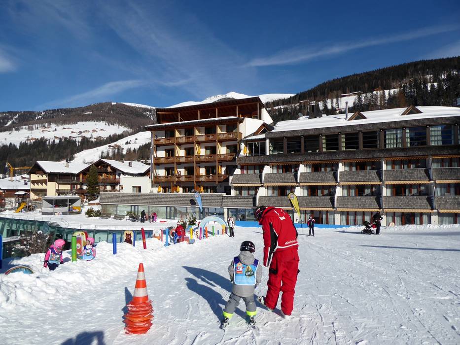 Directement au Family Resort Rainer à Moos se trouve un espace enfants avec tapis magique. L'école de ski Sexten s'occupe de l'espace enfants avec beaucoup d'attention.