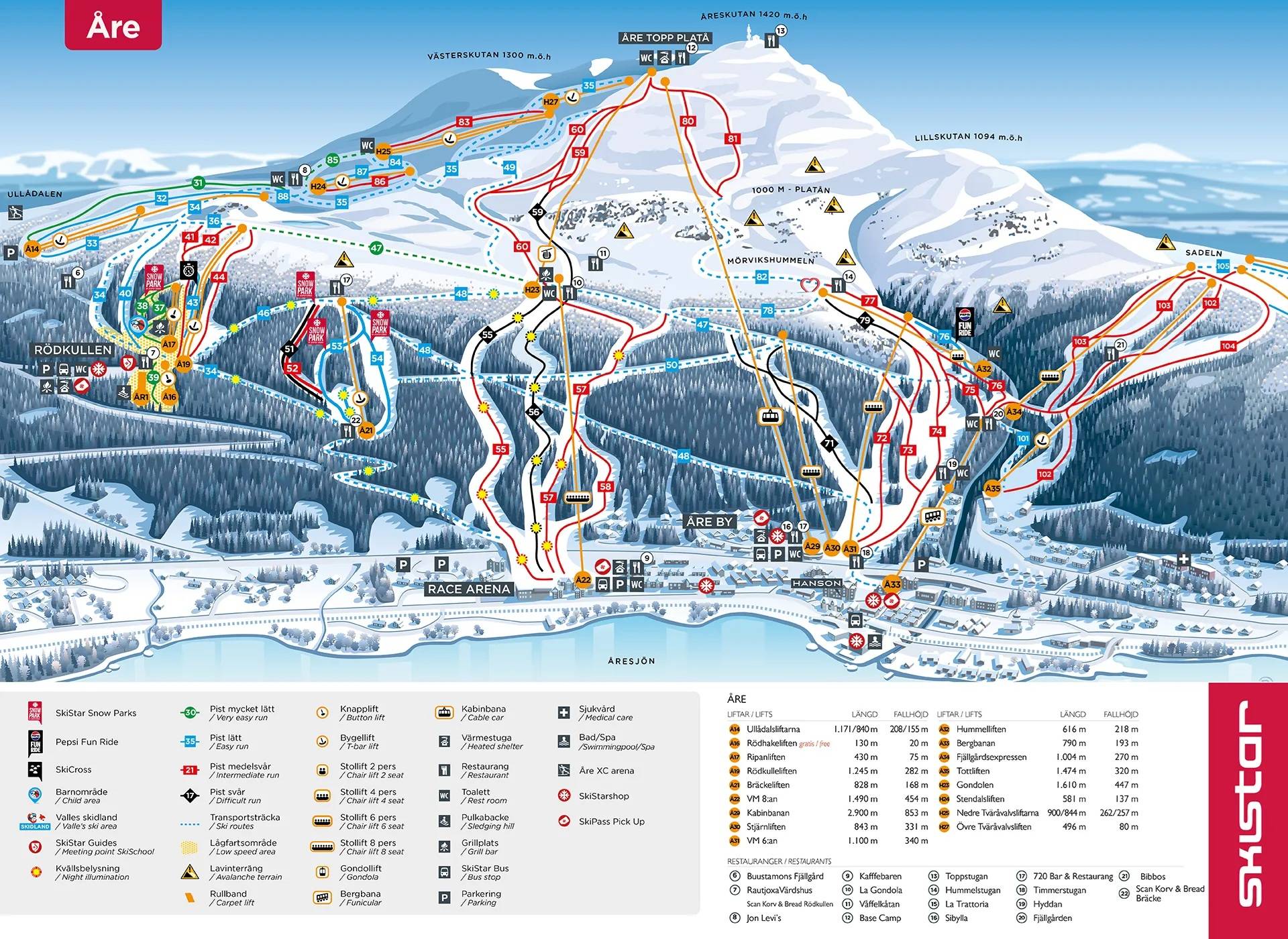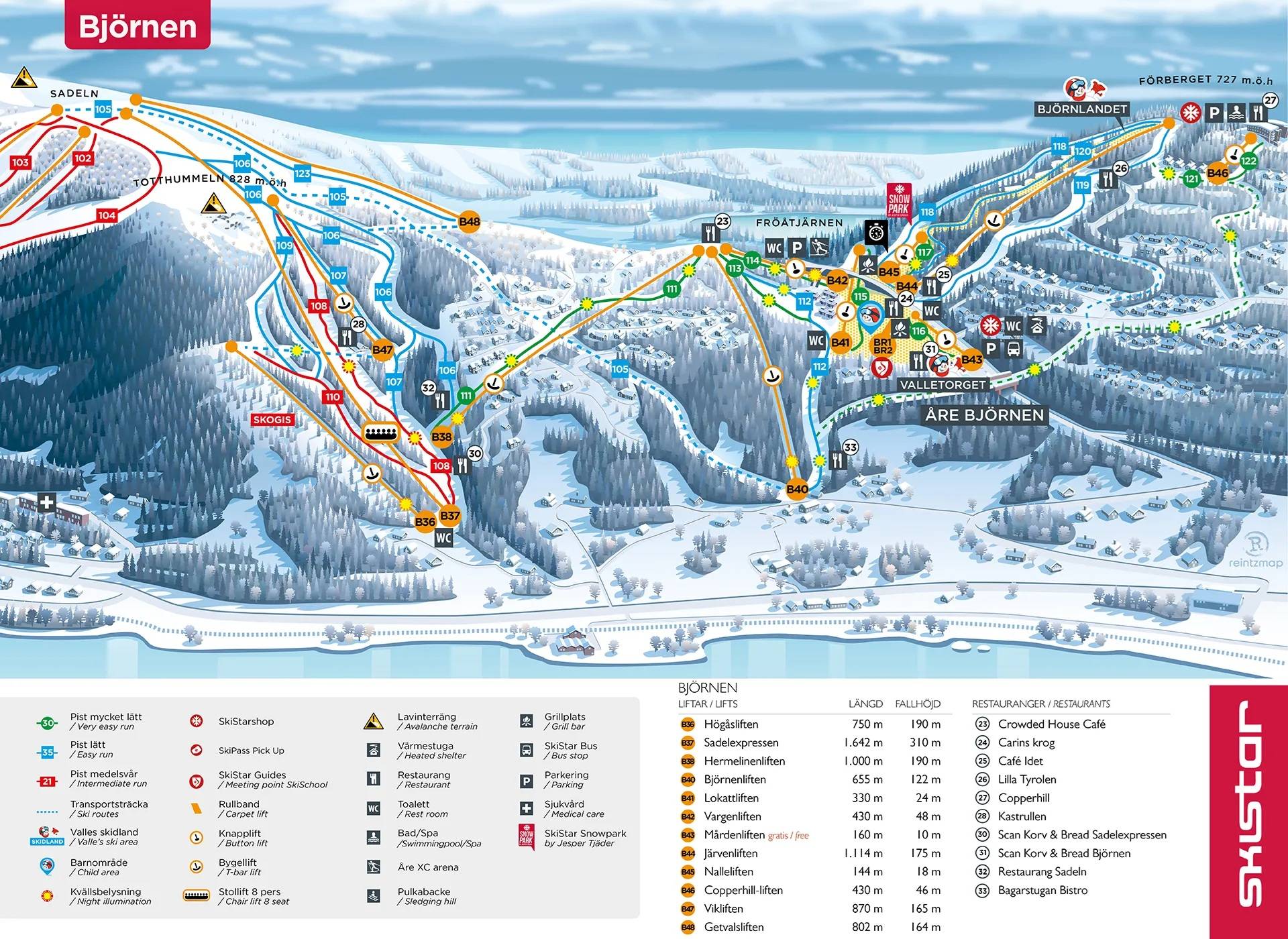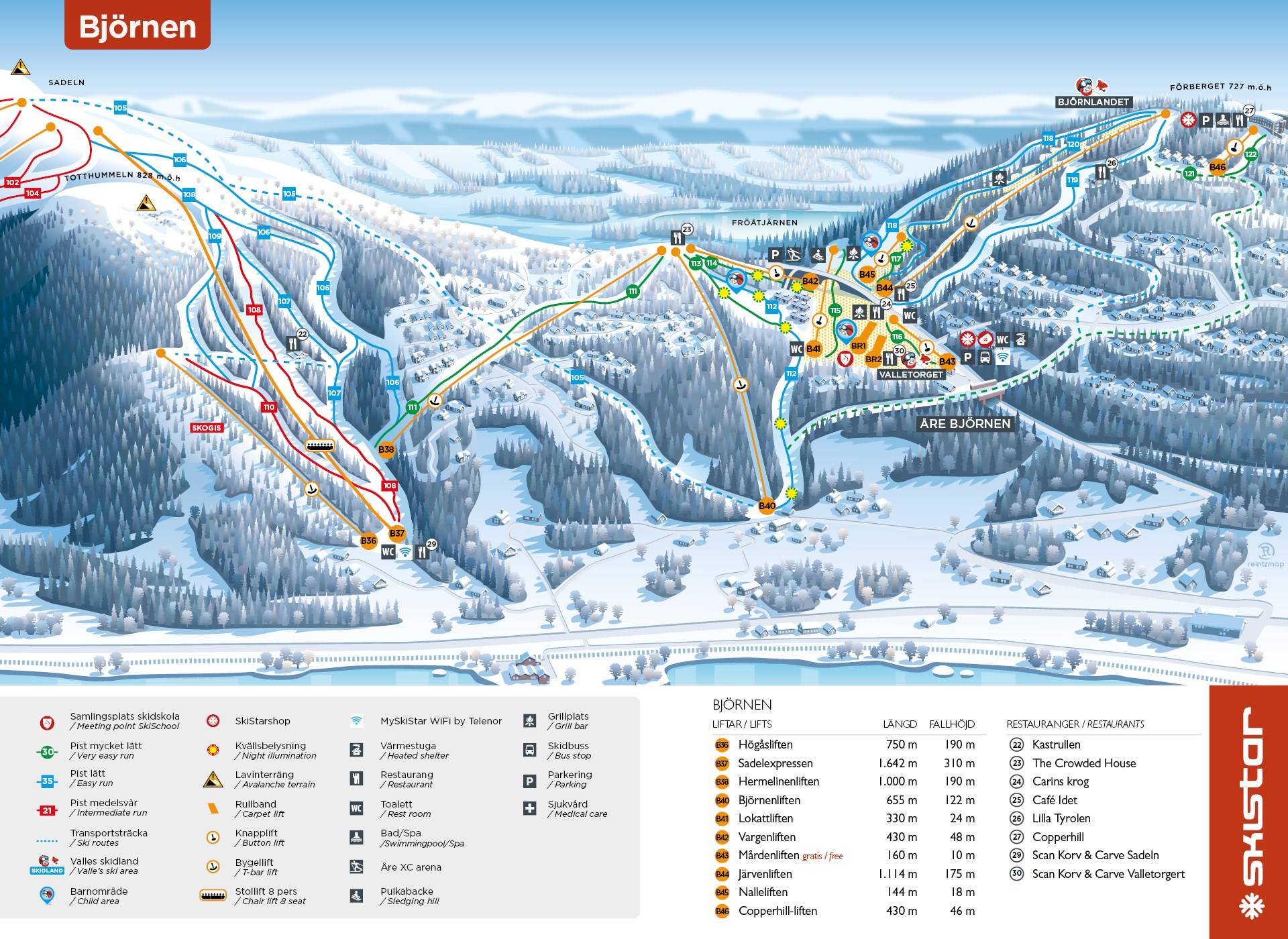 Le plan des pistes représente bien les domaines skiables d’Åre et de Duved. Tous les remontées mécaniques, pistes et points de restauration y sont indiqués. Les remontées sont toutes nommées et accompagnées d’informations supplémentaires. Les pistes sont numérotées, mais malheureusement, il n’y a pas d’autres informations à leur sujet. De même, les altitudes ne sont pas indiquées du tout. Au verso, on trouve des informations sur Valles Ski Adventure et sur les lignes de skibus.