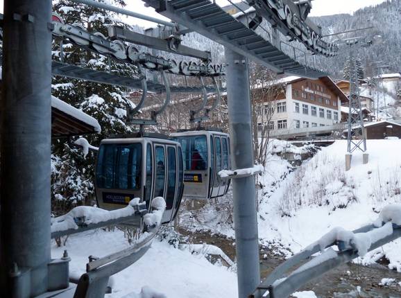 La télécabine à va-et-vient Dorf-Oey effectue un virage. Elle relie la station de vallée de la télécabine 6 places Oey-Bergläger au centre du village.
