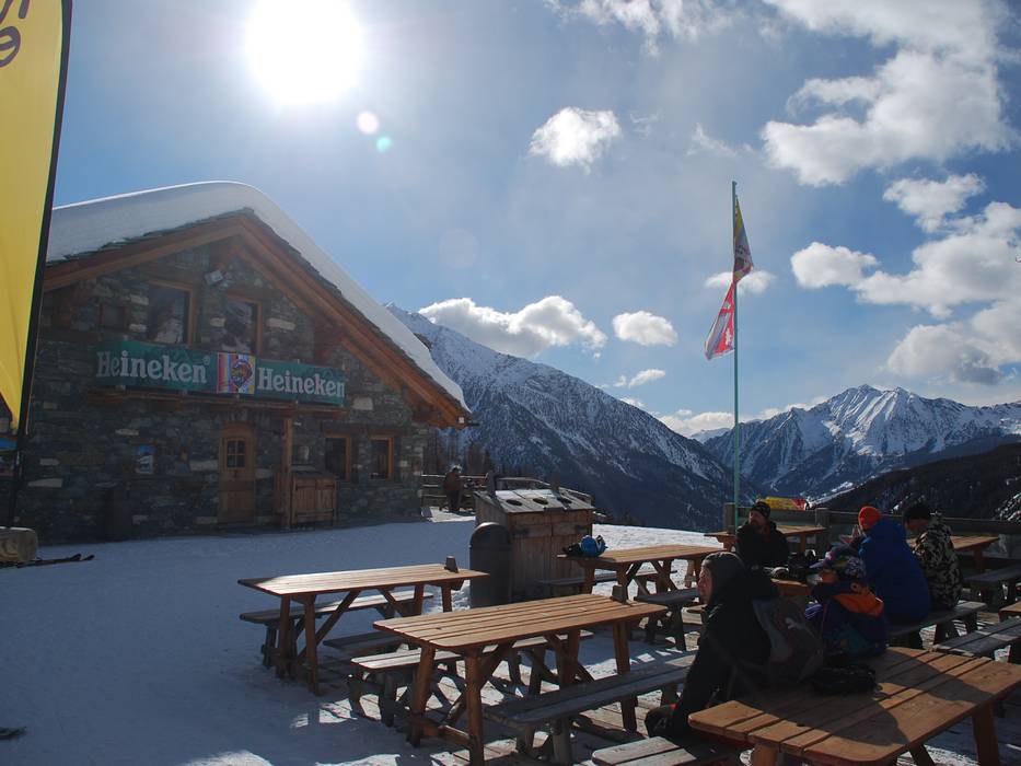 Chalet convivial avec grande terrasse ensoleillée, où l’on peut également dîner le soir ; la descente dans la vallée se fait ensuite en dameuse. Parmi les spécialités, on trouve des raviolis farcis au bœuf, “Robiola“, chou vert et Bagna Cauda, ainsi que les Chnéfléné (spätzle) typiques du val de Gressoney avec du Bleu d’Aoste (fromage). La joue de veau braisée à la bière est une spécialité de refuge originale.