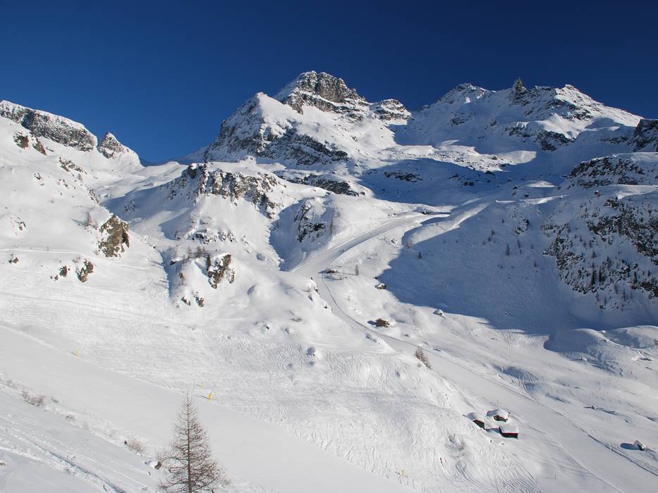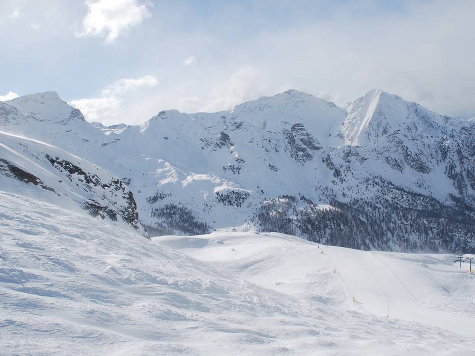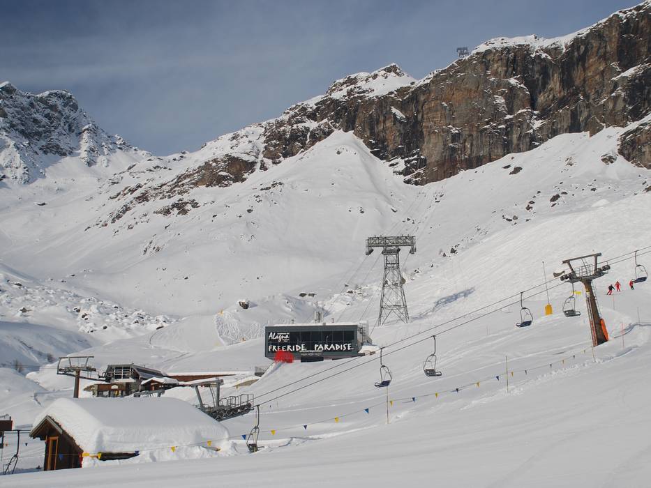 La société des remontées mécaniques d’Alagna est présente sur Internet à l’adresse freerideparadise.it, et il existe effectivement peu de domaines skiables dans les Alpes où une si grande proportion de skieurs évolue avec un sac airbag d’avalanche. Les possibilités de hors-piste sont immenses, surtout si l’on inclut les itinéraires accessibles grâce à l’héliski. La randonnée à la journée, légendaire, traverse le glacier du Grenz jusqu’à Zermatt et revient par le Plateau Rosa dans le Val d’Ayas. Pour le vrai freeride, ce domaine skiable est donc parfait. Dans l’espace sécurisé, les défis sont limités. Les trois pistes noires sont damées chaque jour, et on trouve des bosses sous la ligne du télésiège Alpe Mandria – mais il ne s’agit pas d’une descente officielle.