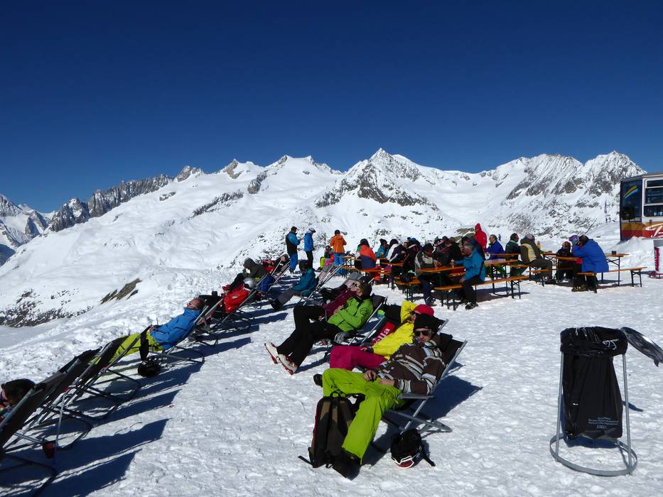 L'après-ski est généralement plus calme dans l'Aletsch Arena. Les bars situés aux points de vue sur le glacier d'Aletsch sont fortement recommandés.