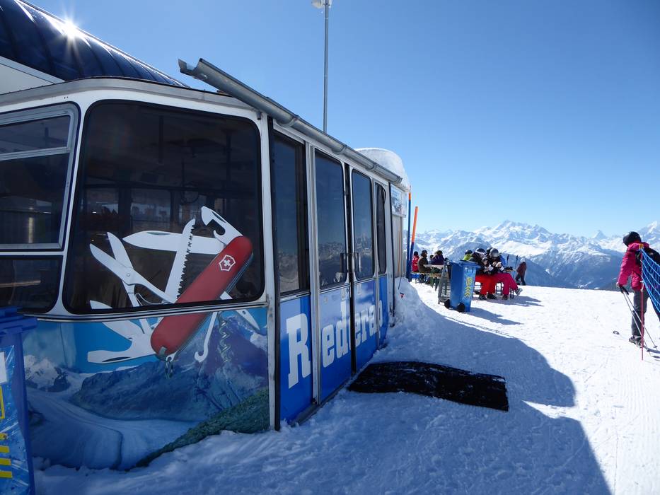 Bar après-ski avec vue sur le Grand Glacier d'Aletsch. Une cabine de téléphérique a été transformée en bar.