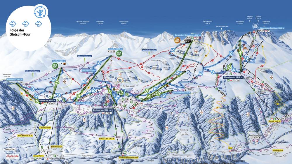 Le circuit panoramique du glacier des Aletsch Bahnen a été entièrement repensé cet hiver, dans le but d’offrir aux skieurs et snowboardeurs un tour exigeant à travers l’ensemble du domaine skiable de l’Aletsch Arena. Les visiteurs peuvent découvrir les plus belles pistes et les points de vue les plus impressionnants sur le Grand Glacier d’Aletsch.aletscharena.ch/gletscher-panorama-tour