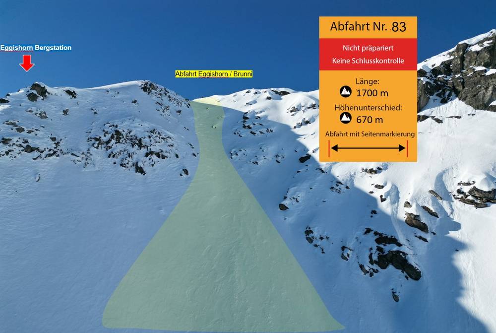La « descente » commence au View Point Eggishorn, derrière la Horli-Hitta. Les 140 premiers mètres de cette « descente » sont très étroits et très raides. L’ensemble du parcours mesure 1700 mètres de long et présente un dénivelé de 670 mètres. La « descente » dans la zone Eggishorn/Brunni se termine au télésiège Heimatt. Une « descente » n’est pas damée et il n’y a pas de contrôle final, mais elle est sécurisée contre les dangers alpins. La « descente » est réservée aux skieurs et skieuses très expérimentés.2023/2024