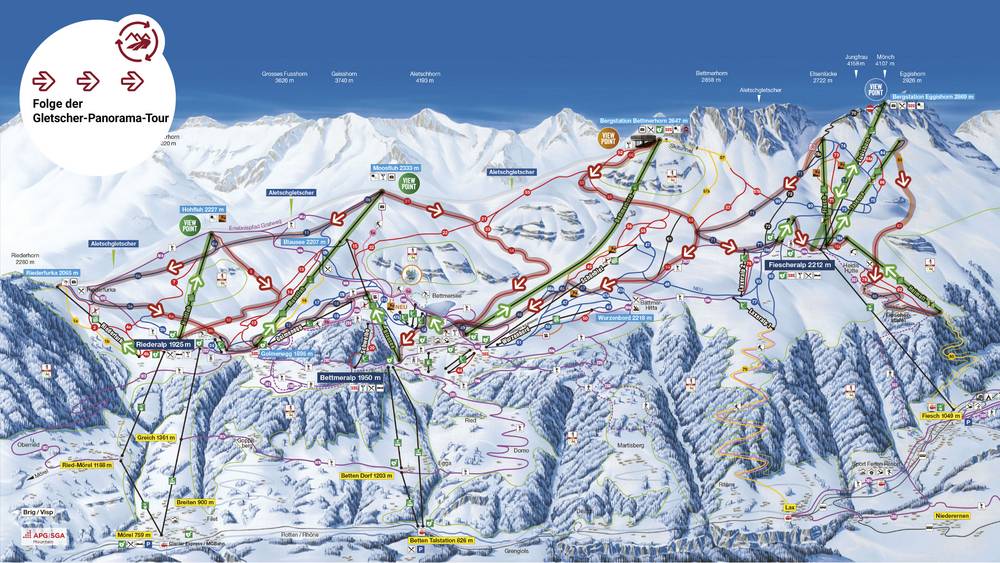 Durant la saison 2014/2015, les remontées mécaniques de l'Aletsch Arena (Riederalp, Bettmeralp, Fiesch-Eggishorn) offrent à ses visiteurs un nouveau forfait, le View Point Pass Aletsch + .Des remontées mécaniques transportent les visiteurs confortablement vers les trois points de vue panoramiques de l'Aletsch Arena (Moosfluh, Bettmerhorn ou Eggishorn). À quelques pas de là, s'étend le grand glacier d'Aletsch.