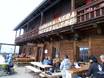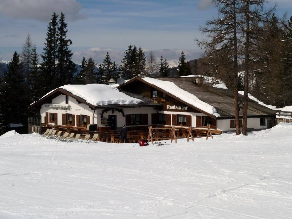 Chalet de montagne rustique avec des spécialités typiques du Tyrol du Sud, situé en plein soleil. Pour se réchauffer, ne manquez pas le "Negermilch".