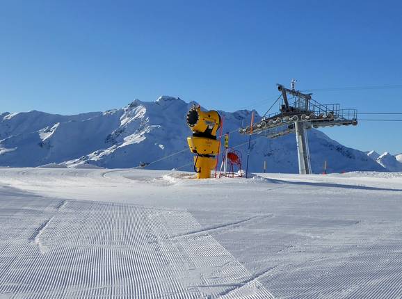 Le domaine skiable Andermatt/Sedrun commence déjà à plus de 1400 m et les descentes jusqu’aux villages peuvent être entièrement enneigées artificiellement. Grâce à son altitude, ce domaine ensoleillé est très enneigé et fiable. Au col de l’Oberalp, chaque installation dispose d’au moins une piste enneigée artificiellement.