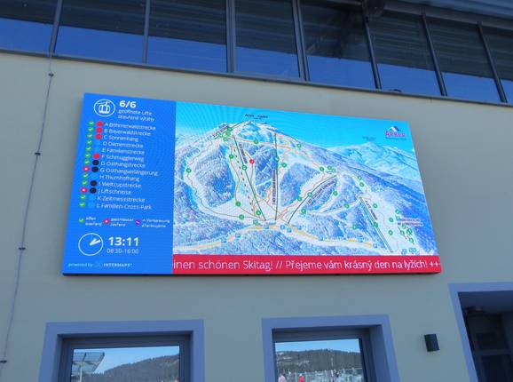 Dans le domaine skiable, plusieurs grands panneaux d'information avec des informations actualisées ainsi que des écrans TV sont répartis. La signalisation sur les pistes est bonne. Il convient également de souligner positivement la signalisation en langue tchèque, car le domaine skiable Arber se trouve non loin de la frontière tchèque.