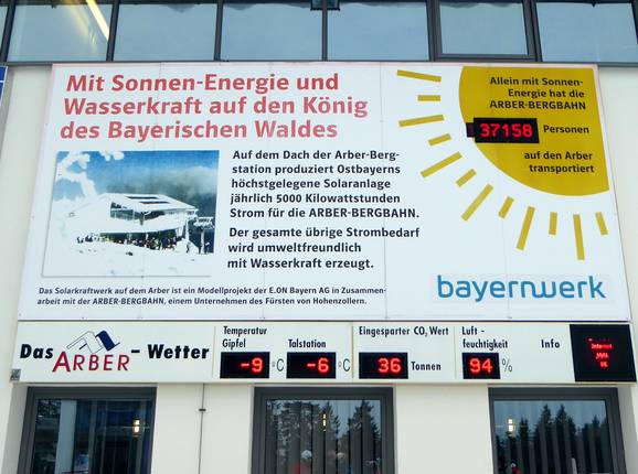 Sur le toit de la station supérieure de l’Arber, la centrale solaire la plus haute de Basse-Bavière produit chaque année 5 000 kilowattheures d’électricité pour le téléphérique de l’Arber. Le reste des besoins en électricité est couvert de manière écologique grâce à l’énergie hydraulique. De plus, des bornes de recharge pour voitures électriques sont disponibles sur le parking.