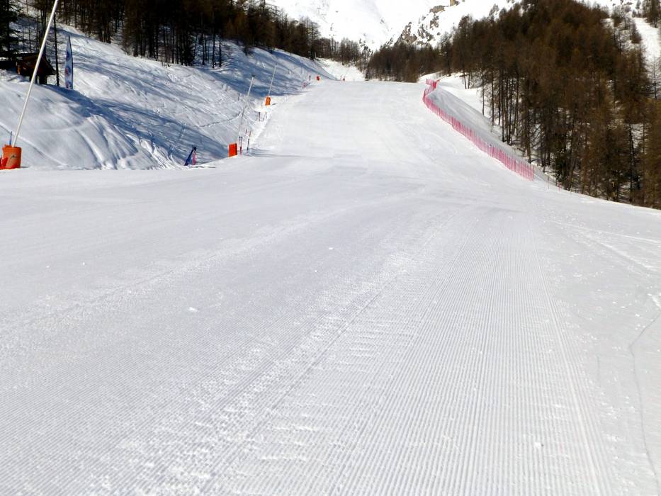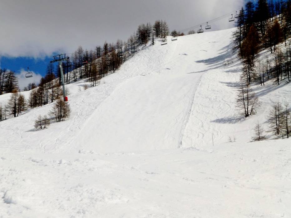 La piste noire exposée au sud Face offre une belle vue sur le village d’Auron. Elle présente une pente raide très difficile et longue.
