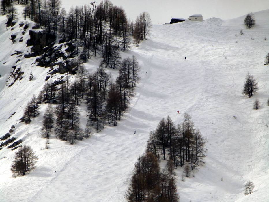 La piste noire exposée au sud Face offre une belle vue sur le village d’Auron. Elle présente une pente raide très difficile et longue.