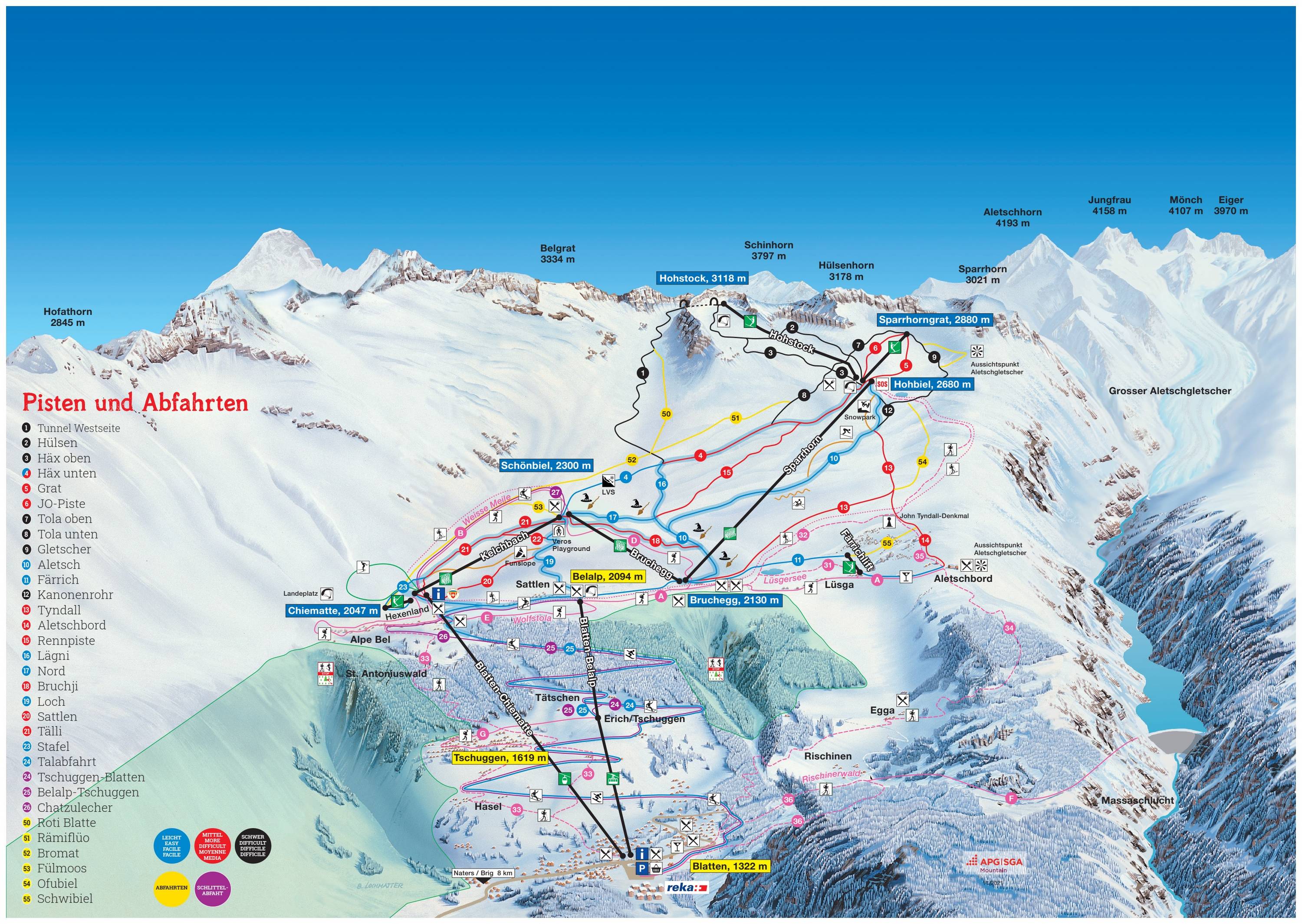 Le plan des pistes représente très bien le domaine skiable de Blatten-Belalp. Tous les remontées mécaniques et pistes y sont indiqués avec les altitudes. Des informations complémentaires se trouvent au verso. Il existe même une carte spéciale pour les enfants (Vero`s verhextes Winterparadies). Les plans des pistes sont disponibles aux caisses, à l’office du tourisme ainsi qu’en ligne.