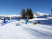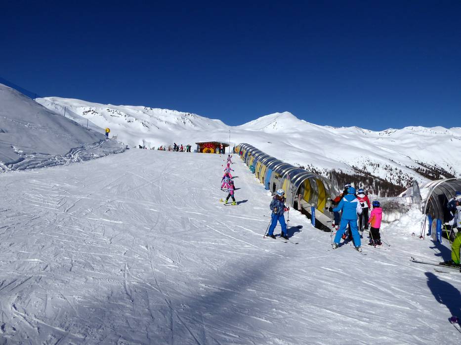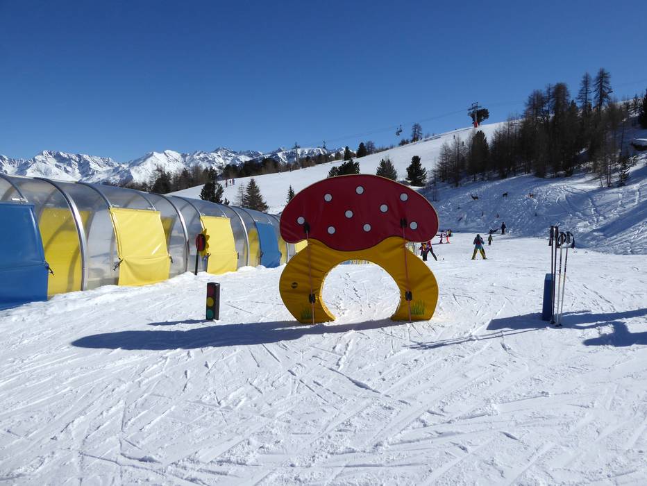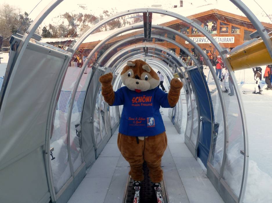 Directement à la station supérieure du Schönebenbahn, à 2150 m d'altitude, se trouve le Schöni's Kinderland. Ici, les petits se sentent très bien sur les tapis roulants et au carrousel pour enfants. Schöni rend également visite régulièrement au Kinderland.