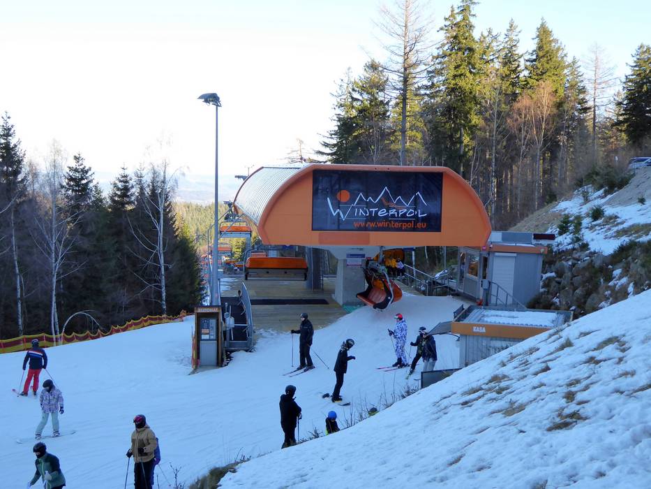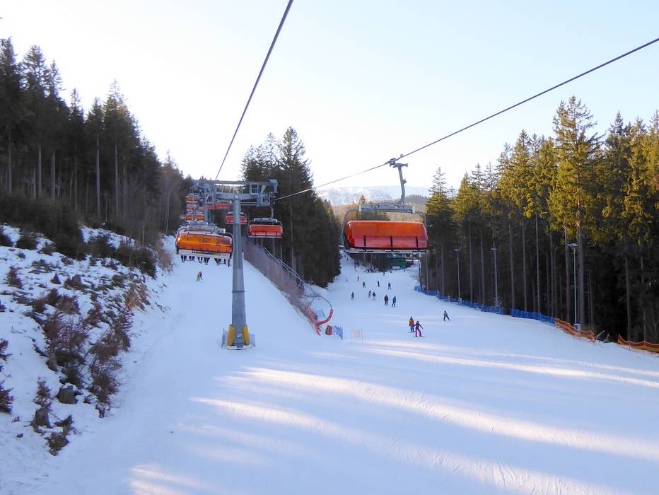 Le télésiège 6 places Biały Jar est équipé de bulles de protection orange.