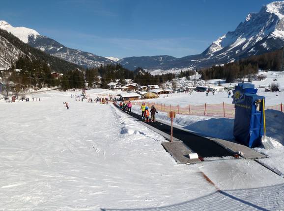 Les familles sont bien accueillies à Biberwier. Elles profitent de la large et facile descente vers la vallée ainsi que du jardin des enfants et du tapis roulant à portée de vue.