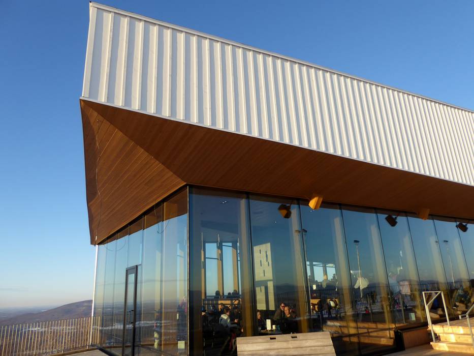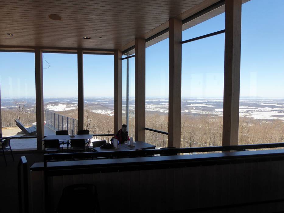 Directement au sommet se trouve le Chalet du Sommet, entièrement rénové et rouvert en décembre 2019. Plusieurs établissements culinaires y sont proposés, comme le Le Daffy, le Bistro L'Escale et Le Comptoir. Vous pouvez y choisir entre des pâtisseries fraîches, des sandwiches, des tartes flambées, des quiches et des pâtes. Le point fort est bien sûr la vue sur les Monteregians et les Appalaches. Il ne faut surtout pas manquer le coucher de soleil d'ici.