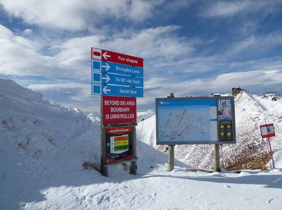 Indications de directions (plans, panneaux informatifs, signalisation) et sécurité sur le domaine skiable Coronet Peak