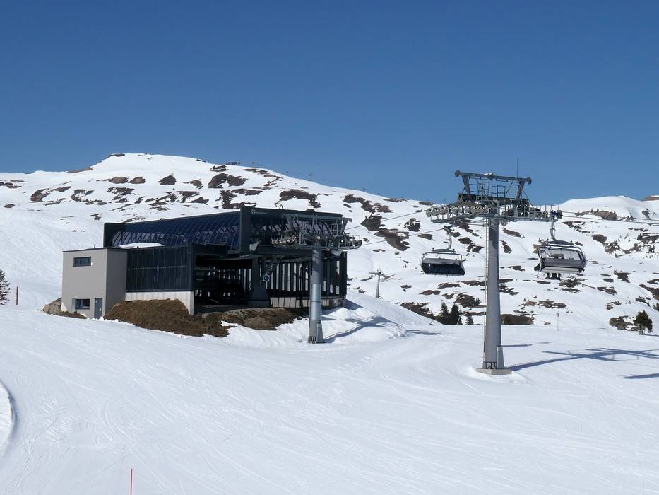 La station amont du nouveau télésiège 6 places a été légèrement déplacée par rapport à son prédécesseur. Ainsi, la descente vers le télésiège 6 places Sunnegg peut désormais se faire en toute tranquillité. Le vitrage est équipé d’une installation photovoltaïque pour la production d’électricité.
