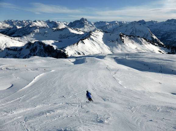 La plus longue descente commence à la station supérieure du Diedamskopf et peut être parcourue d'une traite jusqu'à la station inférieure de la télécabine. Les différentes variantes dans la partie supérieure (1, 1a, 2, 3) n'ont pas d'incidence sur la longueur effective, mais présentent des niveaux de difficulté différents. Il est donc recommandé de maîtriser le niveau de difficulté intermédiaire ou d'emprunter l'itinéraire à ski 21 (plus facile, mais long chemin plat).