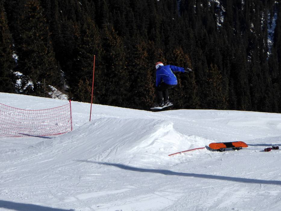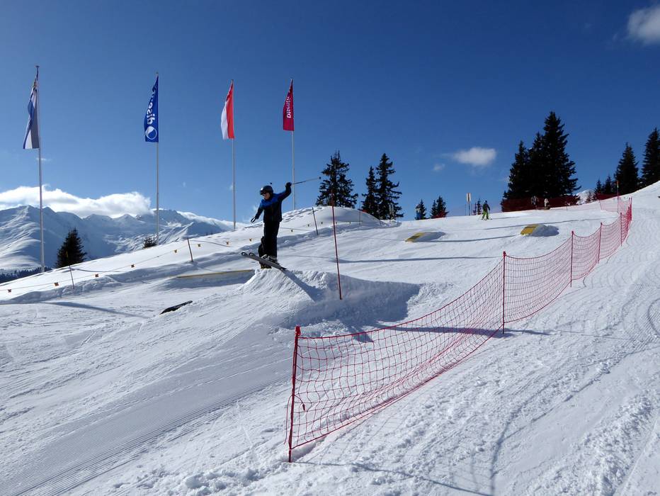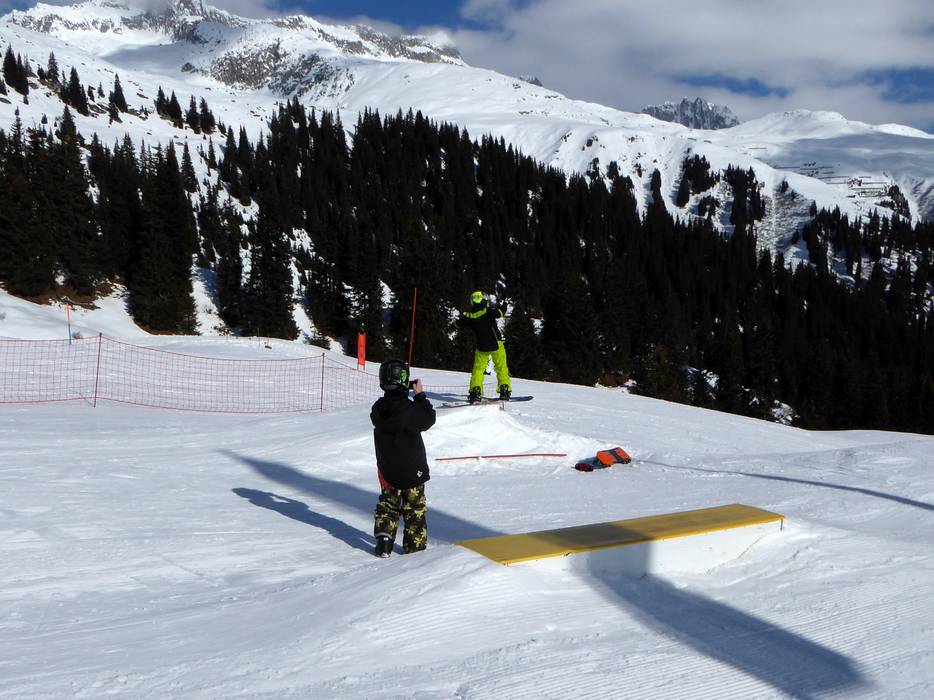 Un petit snowpark avec des kickers et des boxes attend les débutants.