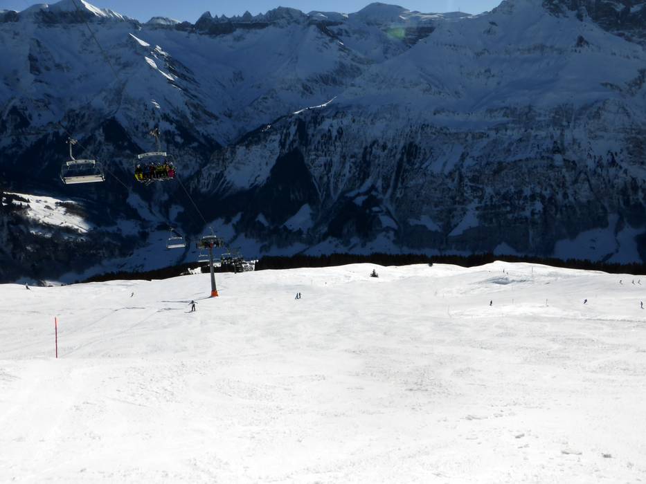 Depuis le point culminant du domaine skiable, au télésiège double Pleus, jusqu'à la vallée en direction d'Elm