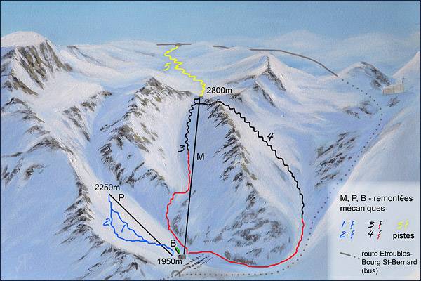 Plan des pistes Espace Super Saint-Bernard – Bourg-St-Pierre Saison ---- !!! closed temporarily/vorübergehend außer Betrieb