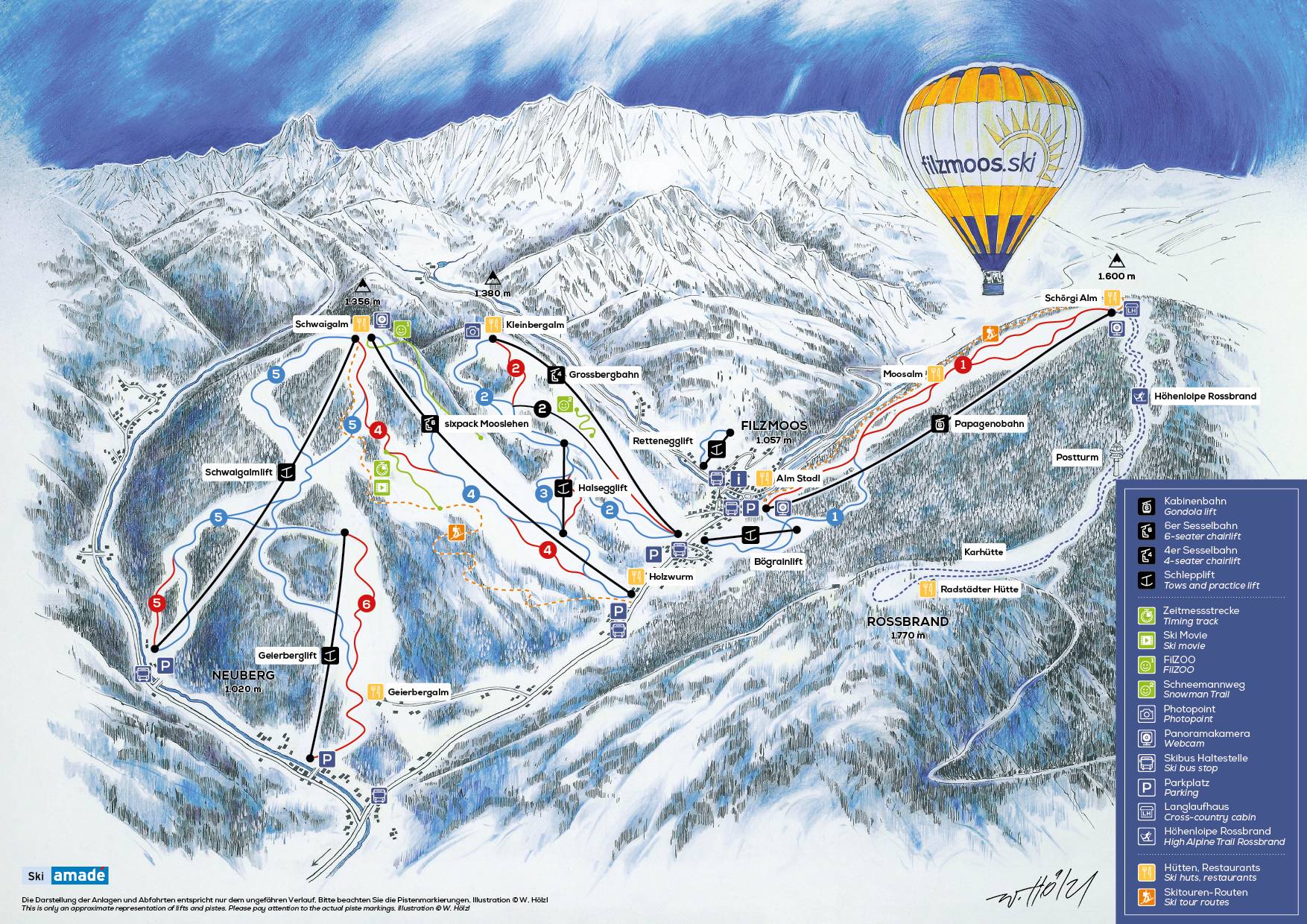 Le plan des pistes illustre bien la liaison skiable entre Filzmoos et Neuberg. Les pistes et les remontées mécaniques sont clairement identifiables. Les points importants du domaine skiable sont indiqués. Des informations détaillées sur certains points pourraient être ajoutées.