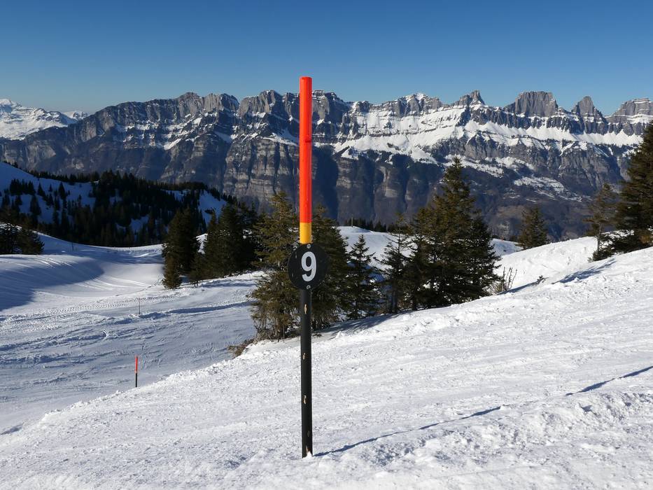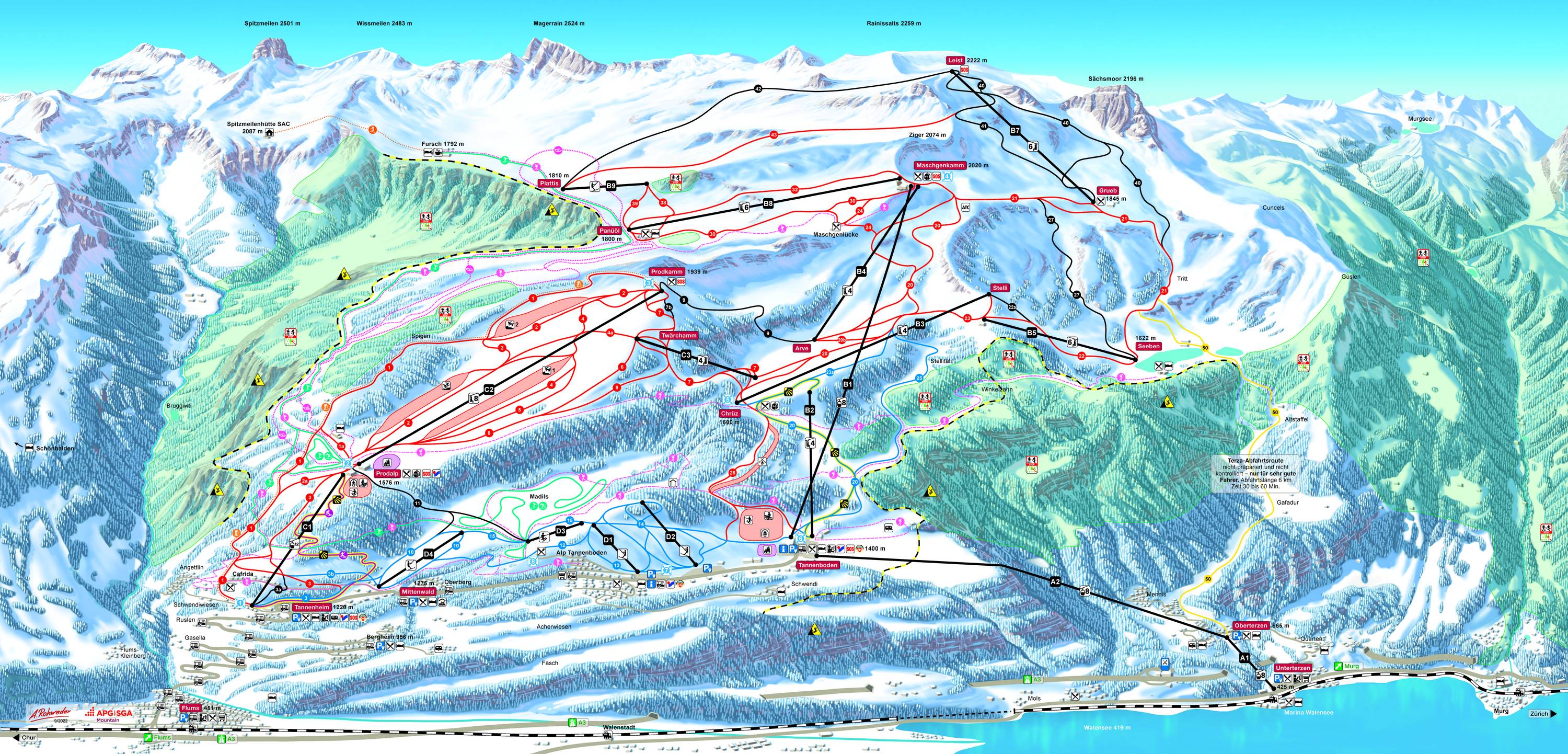 Indications de directions (plans, panneaux informatifs, signalisation) et sécurité sur le domaine skiable Flumserberg