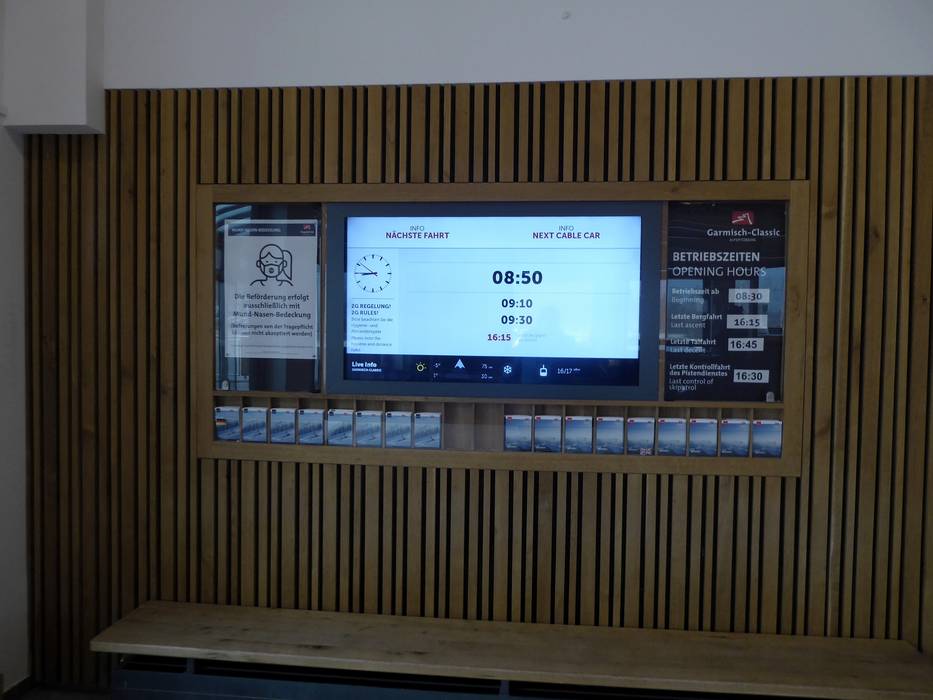 Le plan des pistes représente très bien le domaine skiable Garmisch-Classic. Toutes les pistes et remontées mécaniques sont indiquées et nommées en bas du plan. Les refuges sont également signalés. Des informations sur les tarifs et l’horaire du Zugspitzbahn sont aussi disponibles.