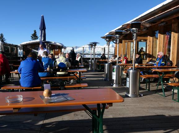 Au Glungezer, l'ambiance est plutôt calme. On profite de la fin de la journée de ski dans les refuges du domaine skiable ou au Larchnhittl, situé en dessous de la station inférieure du Glungezerbahn.