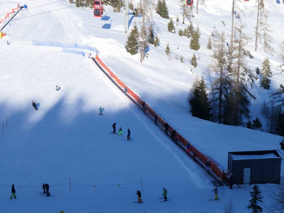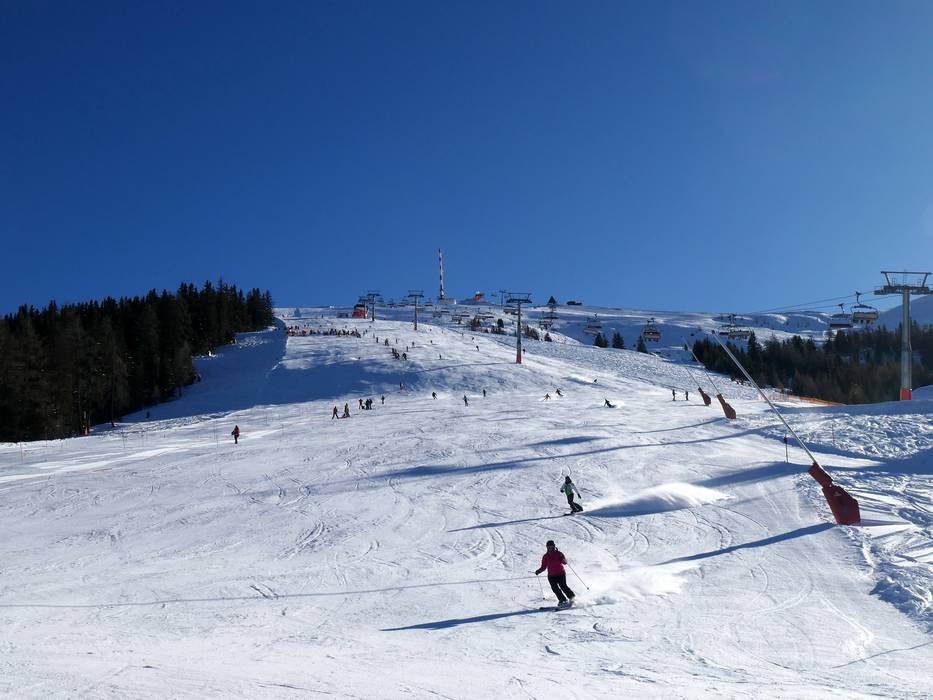 Ensuite, on peut progresser idéalement sur les pistes larges et faciles desservies par les télésièges. L’itinéraire noir vers la vallée n’est pas adapté aux débutants et il est conseillé de redescendre en télécabine.