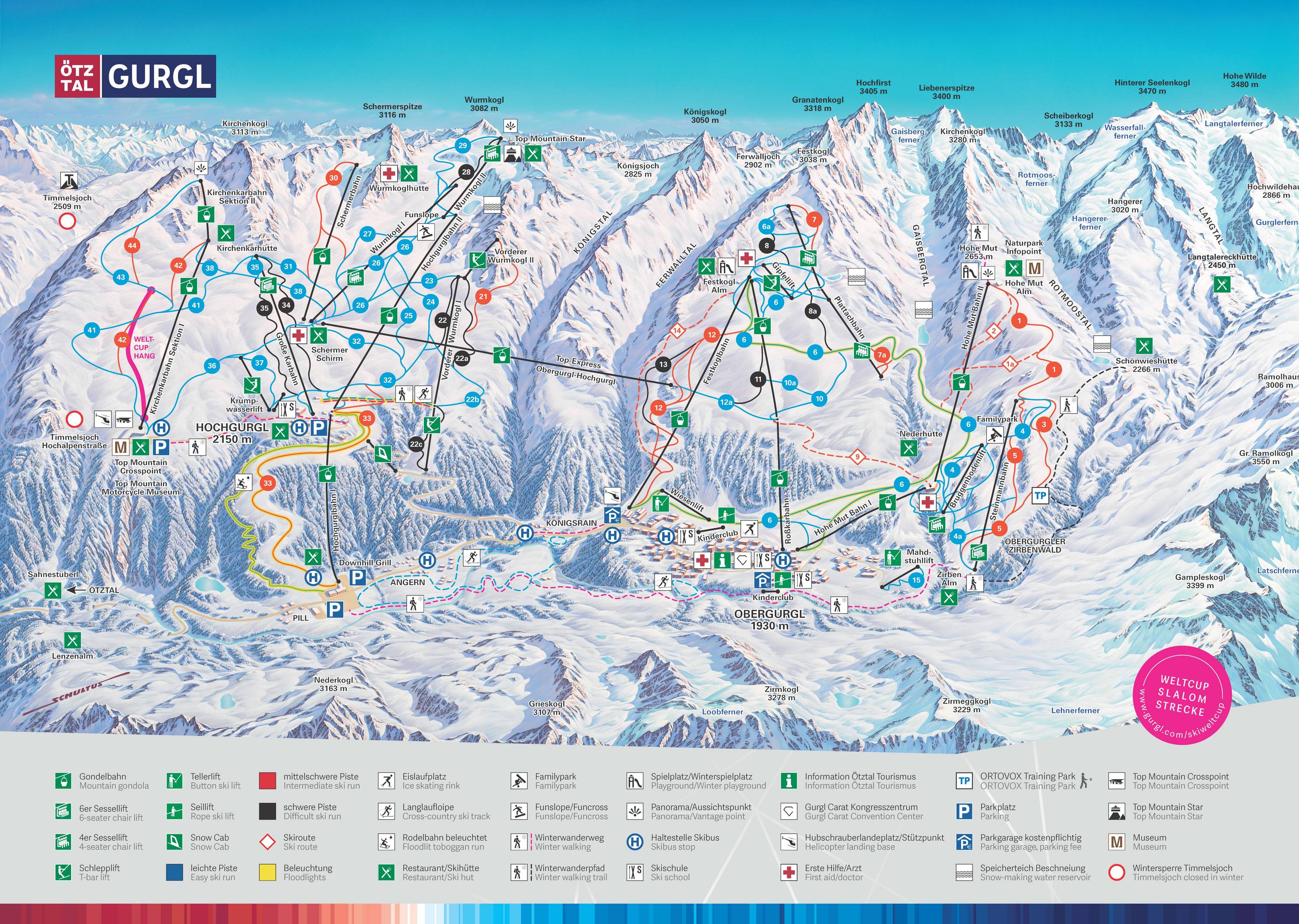 Le plan des pistes représente très bien le domaine skiable d'Obergurgl-Hochgurgl. Tous les remontées mécaniques et pistes y sont indiqués. De plus, toutes les cabanes y figurent avec des photos et des descriptions. Au verso, les prix des forfaits de ski, les écoles de ski et les points forts du domaine skiable sont très bien décrits. Le plan a également un format très pratique.
