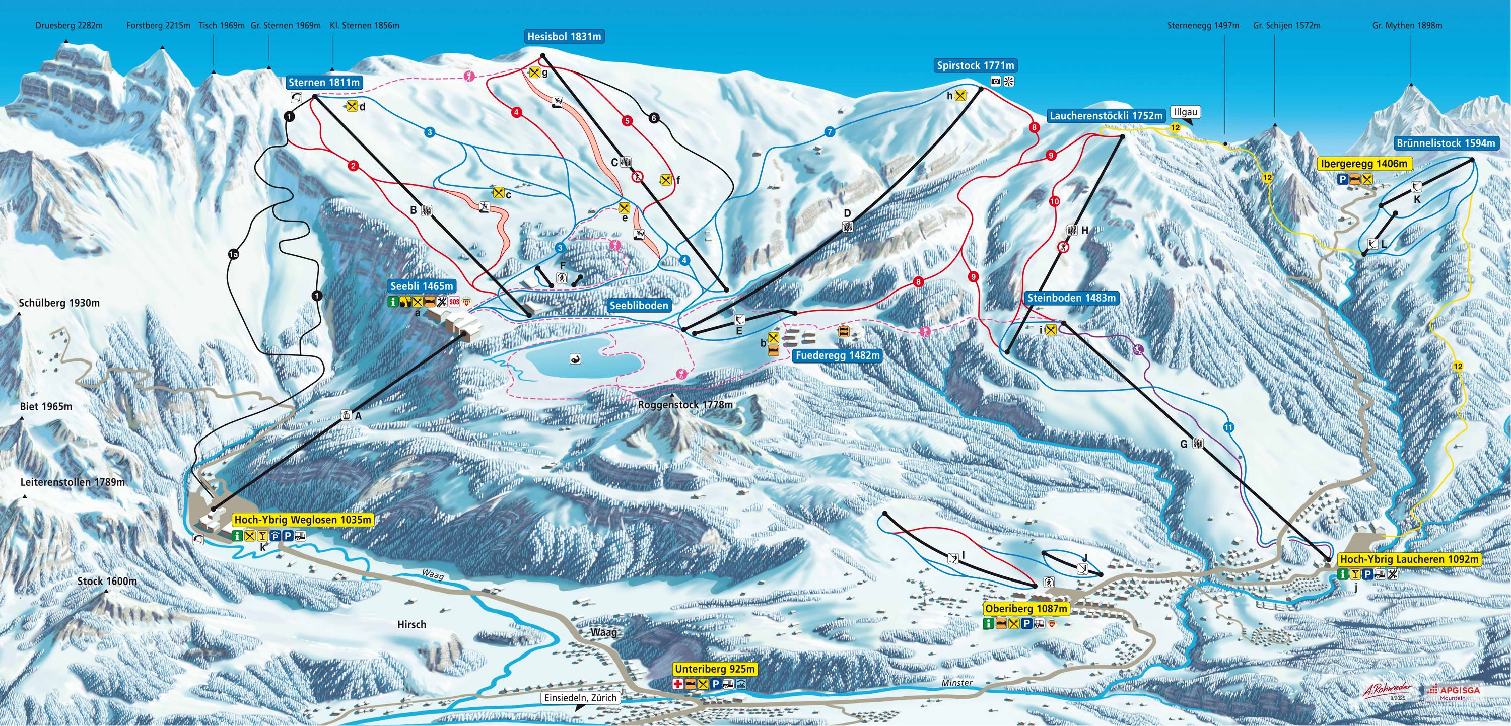 Le plan des pistes représente très bien le domaine skiable de Hoch-Ybrig. Tous les remontées mécaniques, pistes et possibilités de restauration y sont indiqués et décrits en détail. Au verso, on trouve d'autres informations sur le domaine skiable.