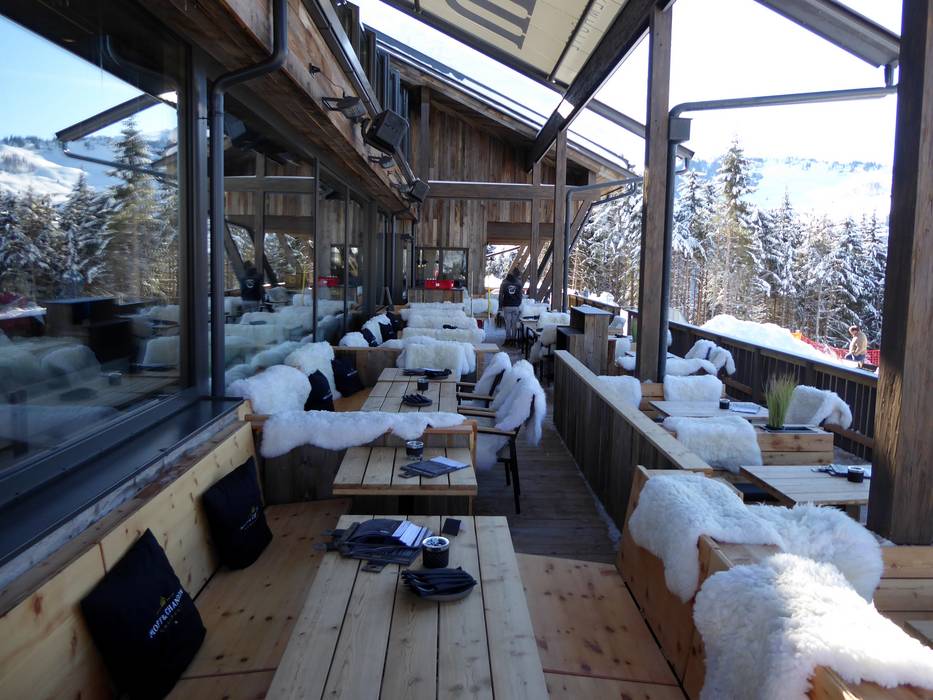 Deux chalets confortables et authentiques sont reliés par un espace bar et lounge décontracté. Au-dessus, la grande terrasse panoramique offre aux visiteurs une vue splendide sur les montagnes – un cinéma en plein air pour un horizon sans limites.