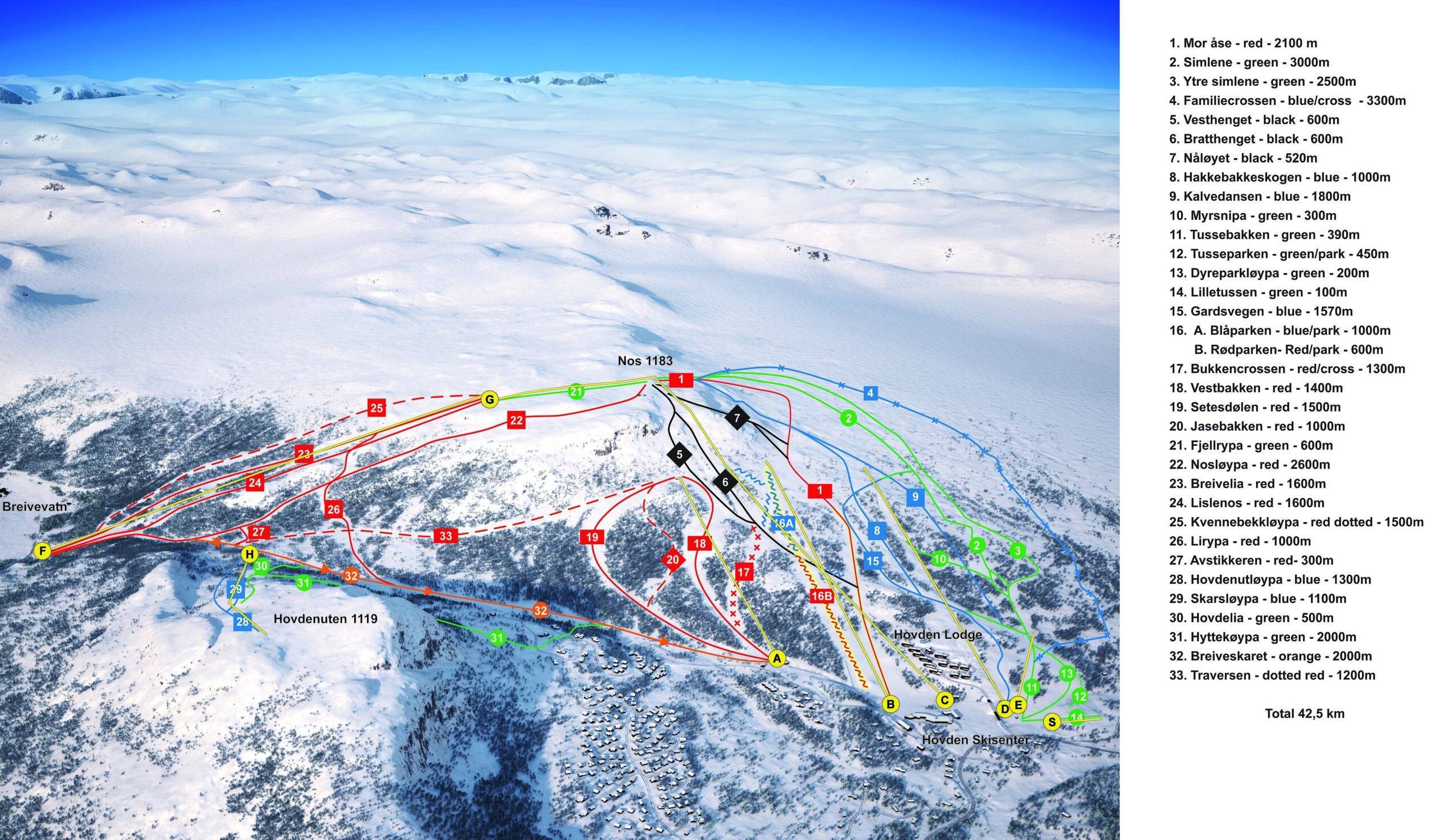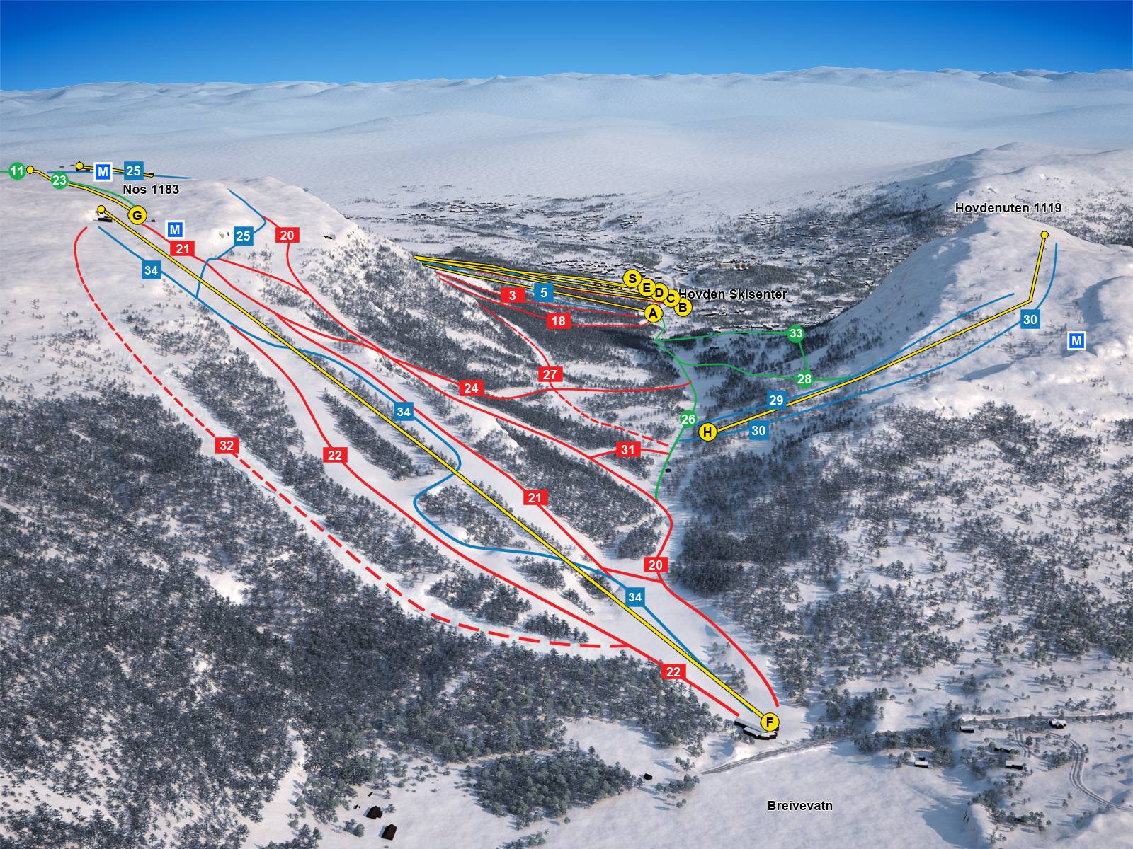 Le plan des pistes du Hovden Alpinsenter représente très bien le domaine skiable. Tous les remontées mécaniques et les pistes y sont indiqués avec des informations détaillées. Il serait souhaitable d’y ajouter davantage d’indications sur l’altitude et des informations sur les possibilités de restauration.