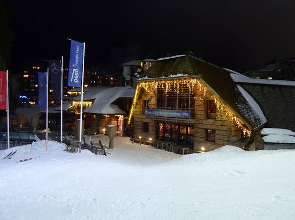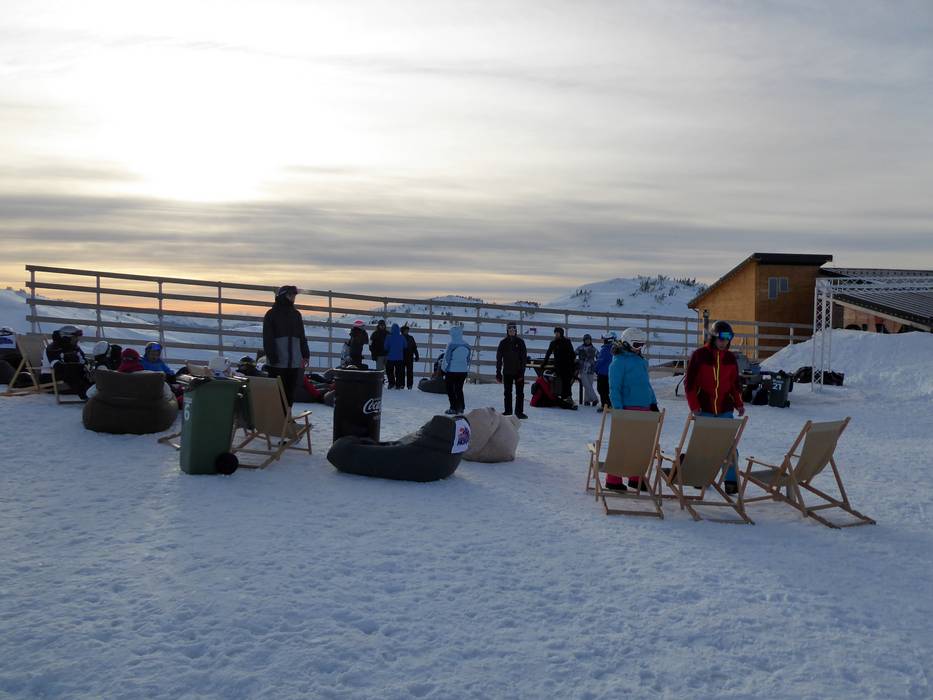 Au sommet, la journée de ski se termine devant l’Olimp Bar avec DJ et musique forte. Mais à 16 heures, il faut redescendre dans la vallée.