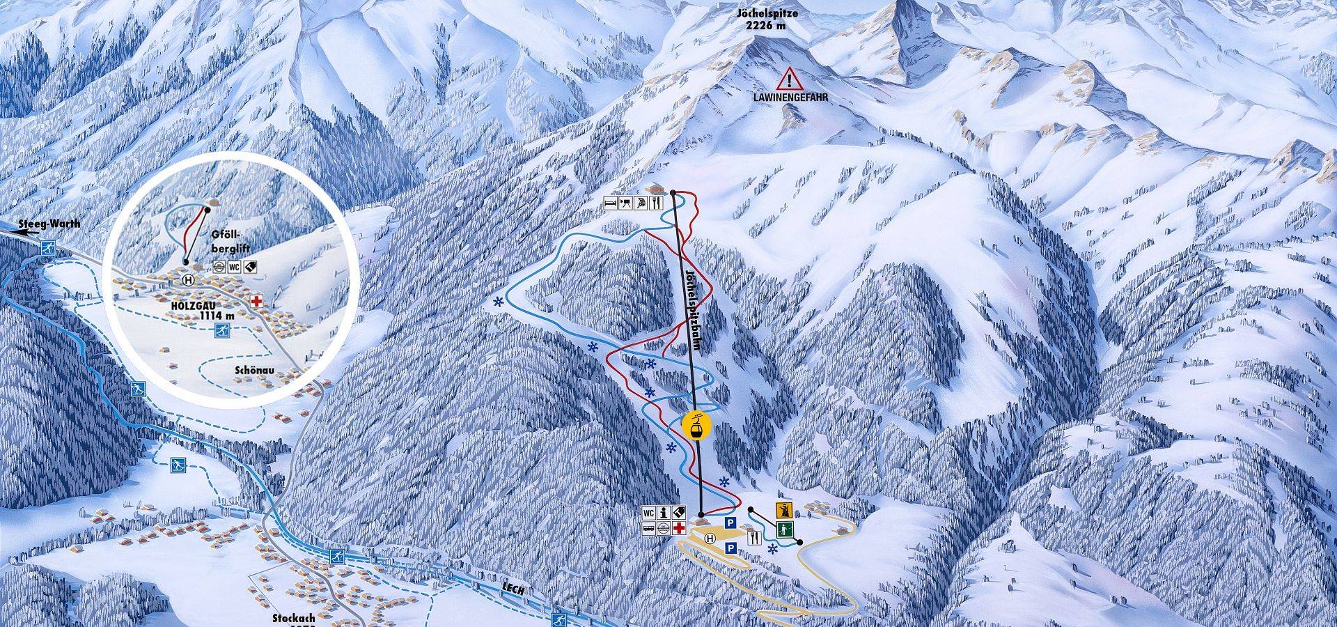 Le plan des pistes présente en détail le petit domaine skiable de Jöchelspitze. De nombreuses autres informations ainsi que les différents tarifs y sont indiqués.