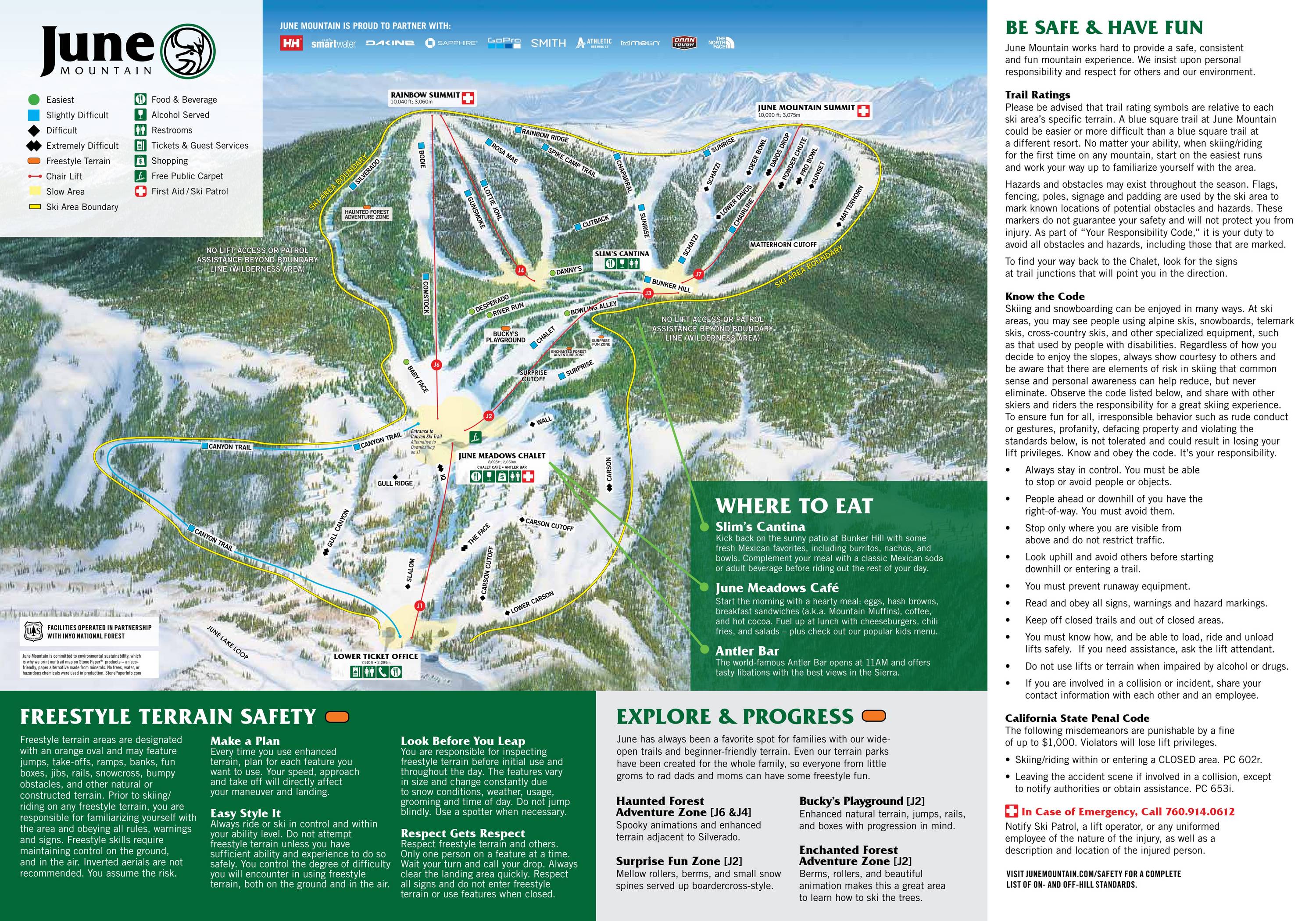 Indications de directions (plans, panneaux informatifs, signalisation) et sécurité sur le domaine skiable June Mountain