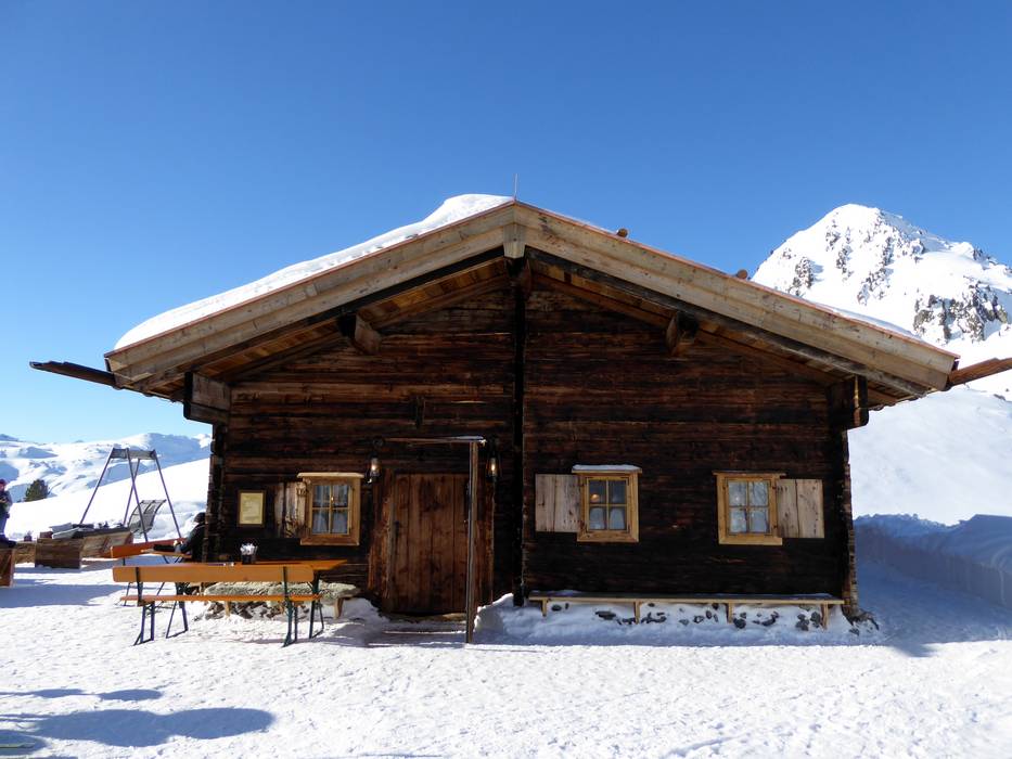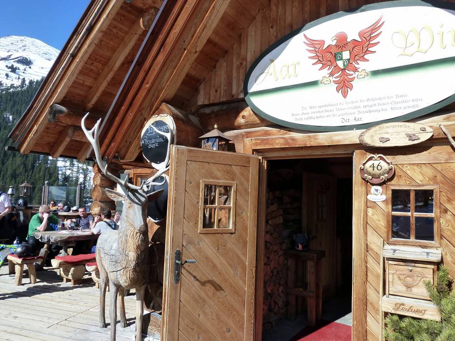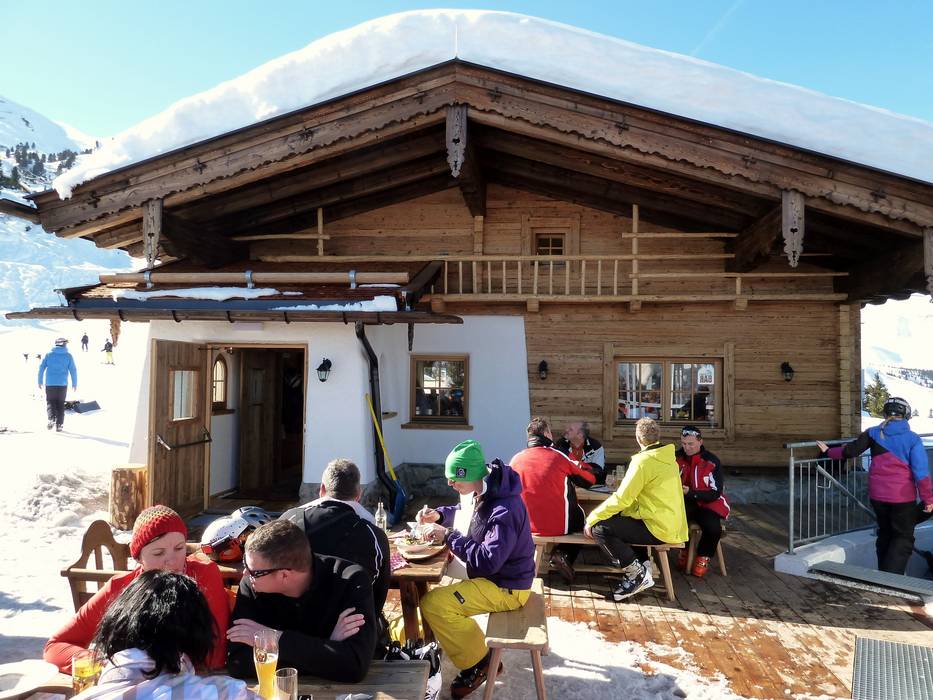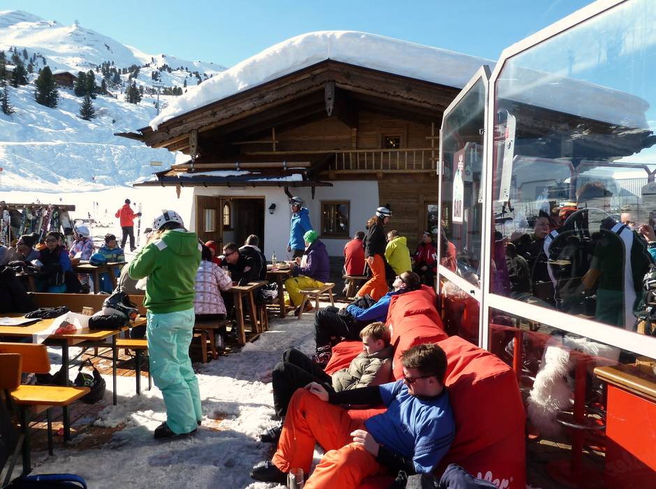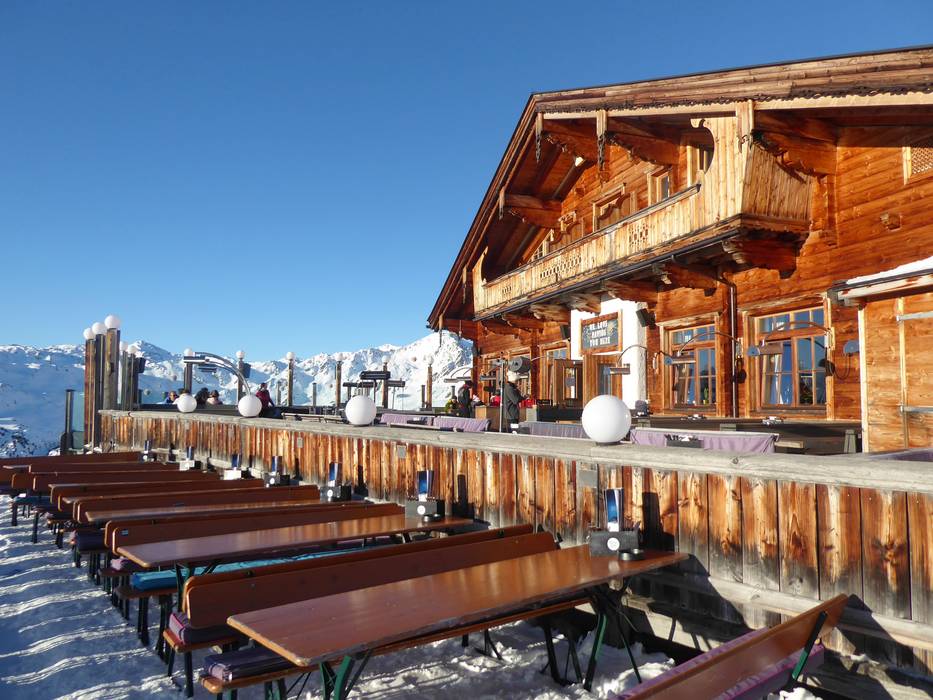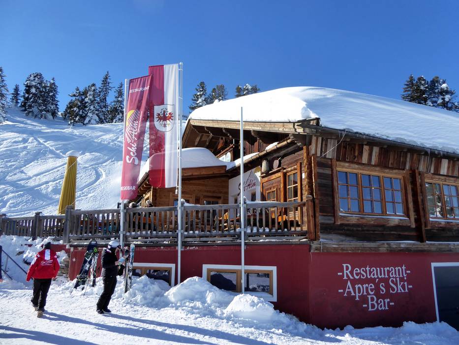 Chalet de ski rustique avec spécialités tyroliennes et bar après-ski devant la maison. Par beau temps, la terrasse ensoleillée invite à la détente.