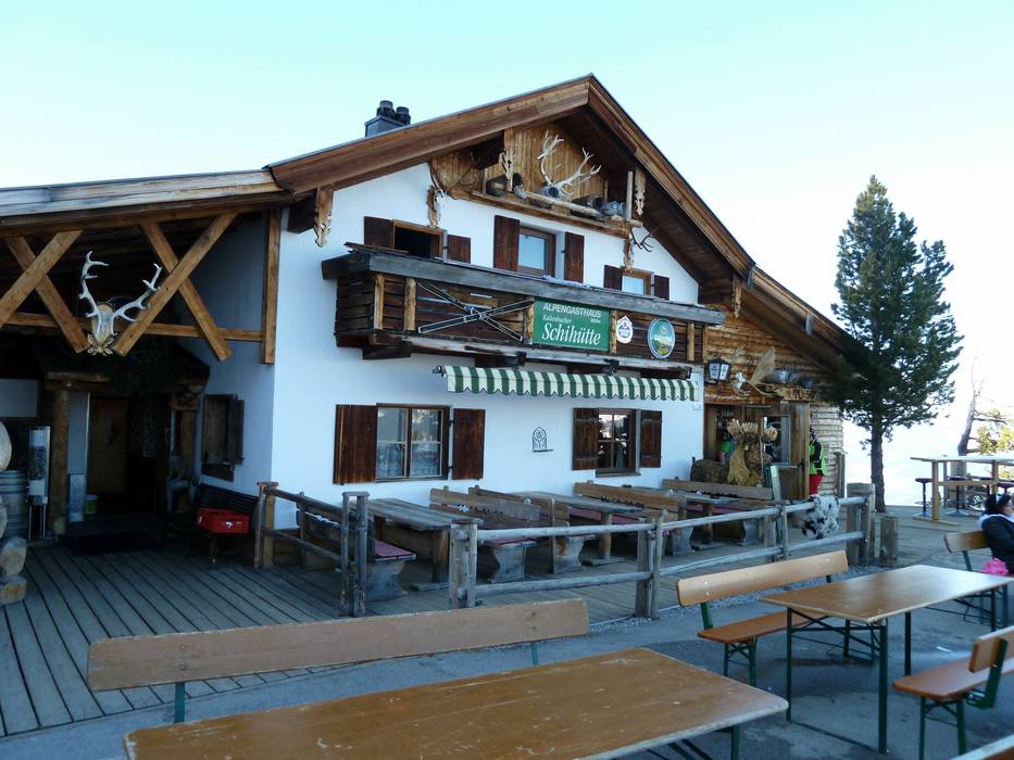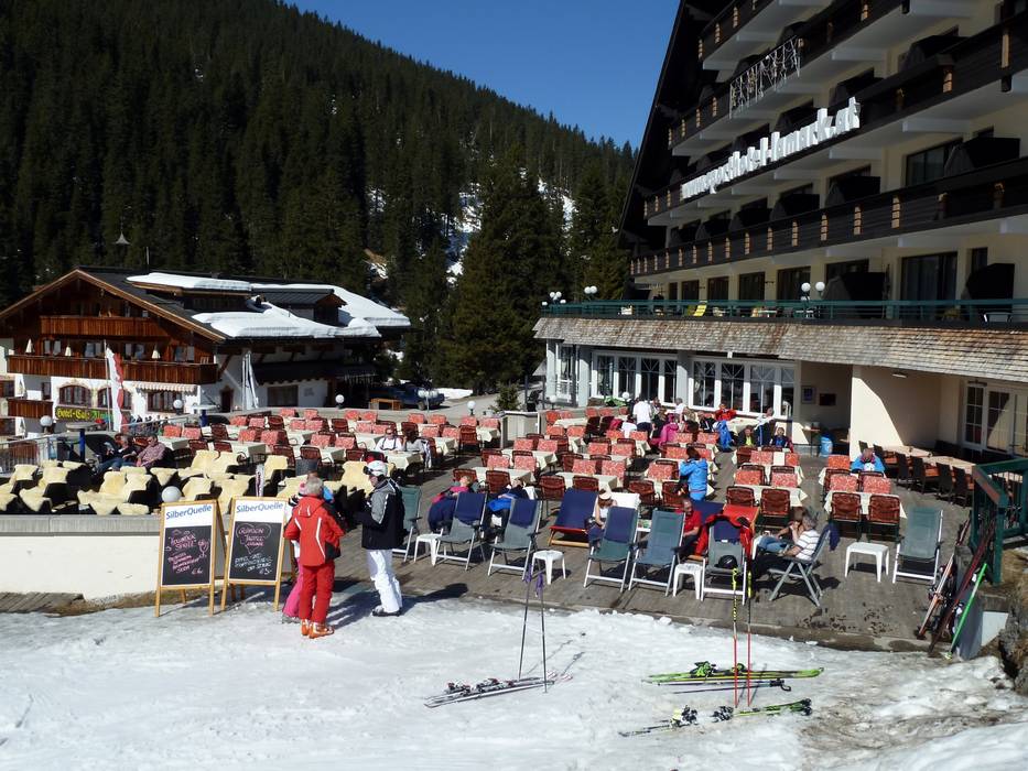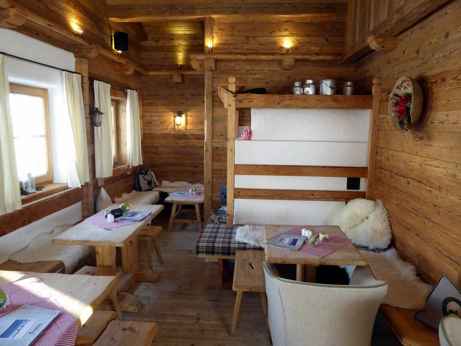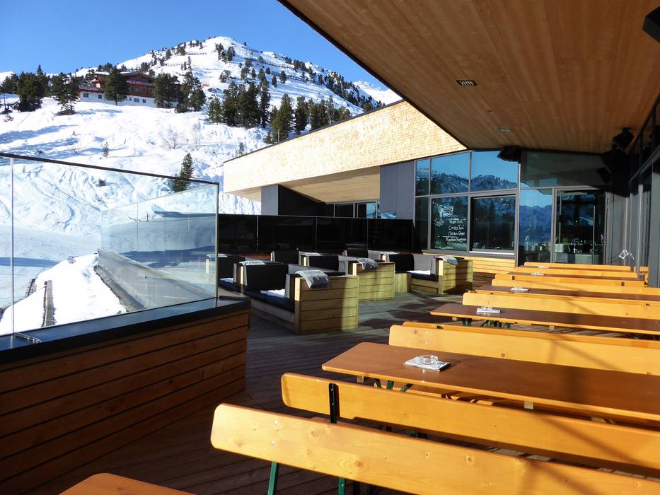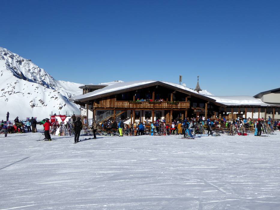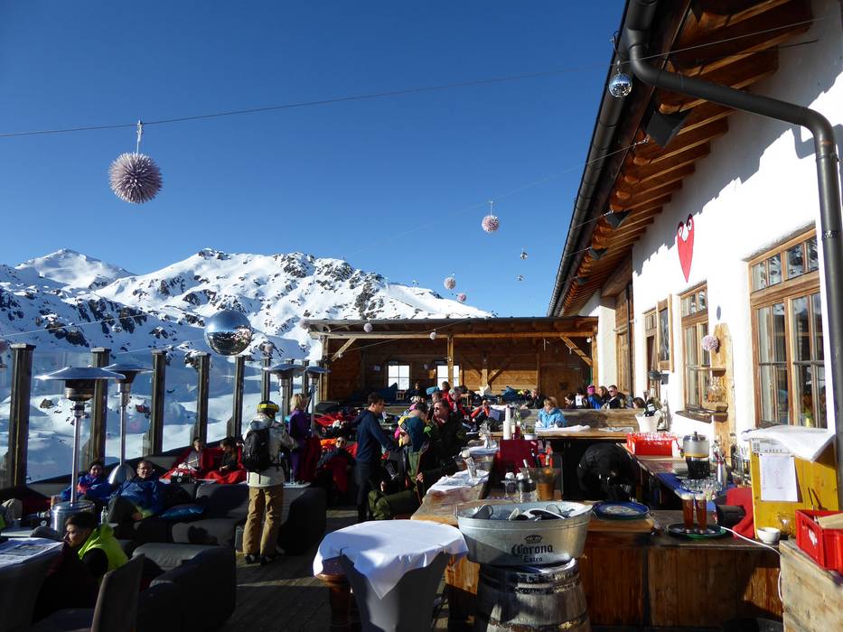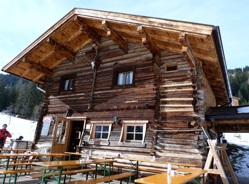 Chalet de ski rustique avec spécialités tyroliennes et bar après-ski devant la maison. Par beau temps, la terrasse ensoleillée invite à la détente.