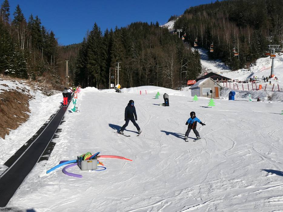 Klínovec est très bien adapté aux débutants. La zone Dámska offre un terrain d’entraînement idéal pour les premiers pas. Vous y trouverez une école de ski avec des tapis roulants (Max/JPK), un téléski privé ainsi qu’une piste facile le long du télésiège Dámska. D’ici, il est également possible d’accéder à d’autres descentes faciles.