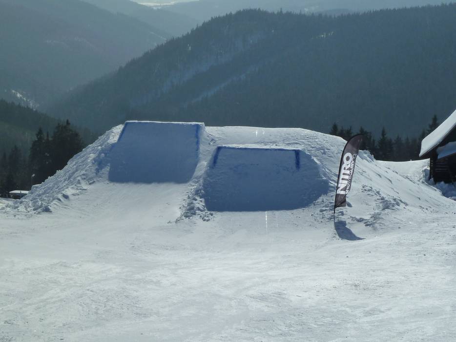 Snowpark avec jumps, boxes et rails au téléski Vlek D