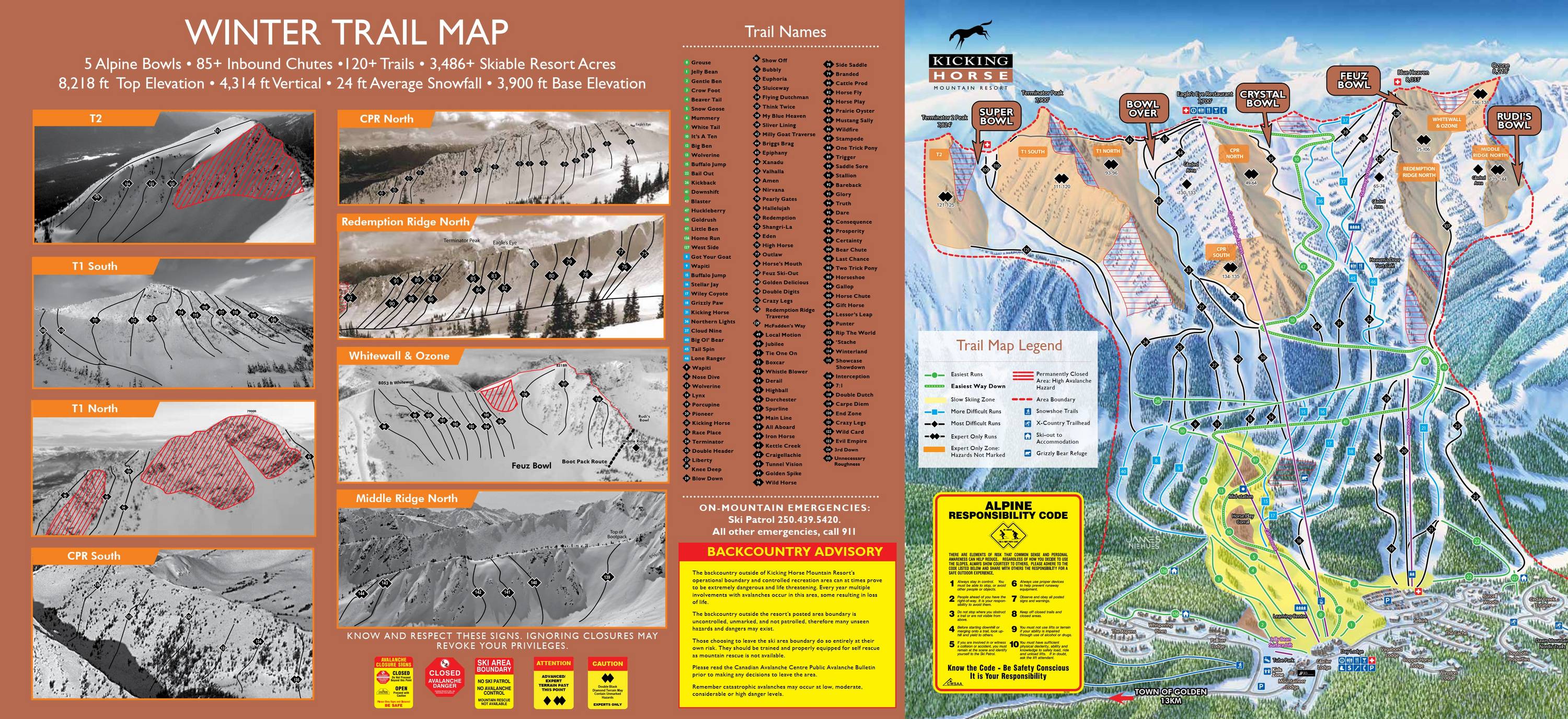 Le plan des pistes représente très bien le domaine skiable de Kicking Horse. Tous les remontées mécaniques, pistes, restaurants et hébergements y sont indiqués. Chacune des descentes est identifiée par un numéro et un nom. Ainsi, on s’oriente toujours facilement dans le domaine skiable.