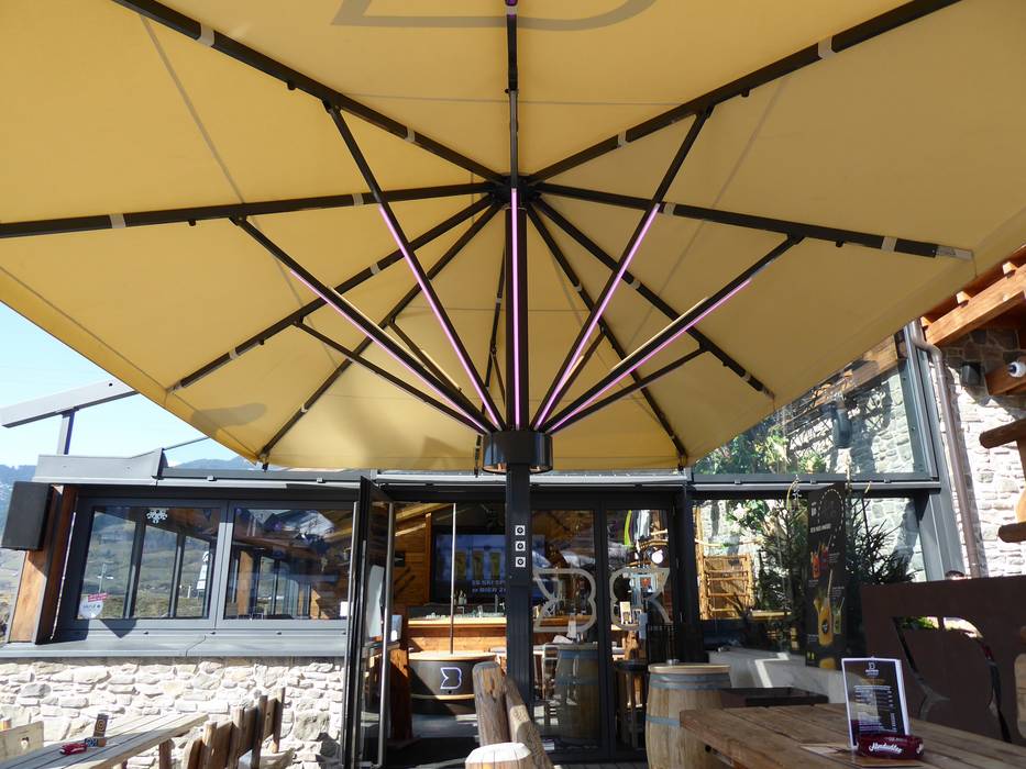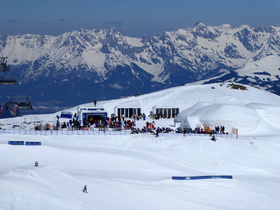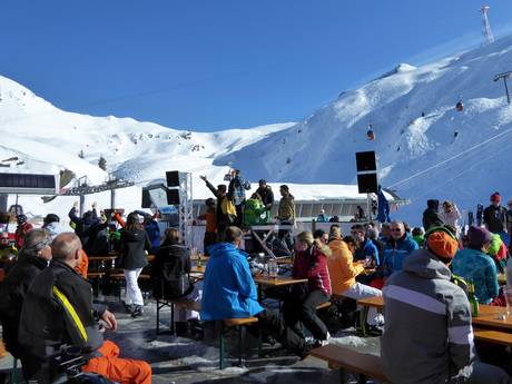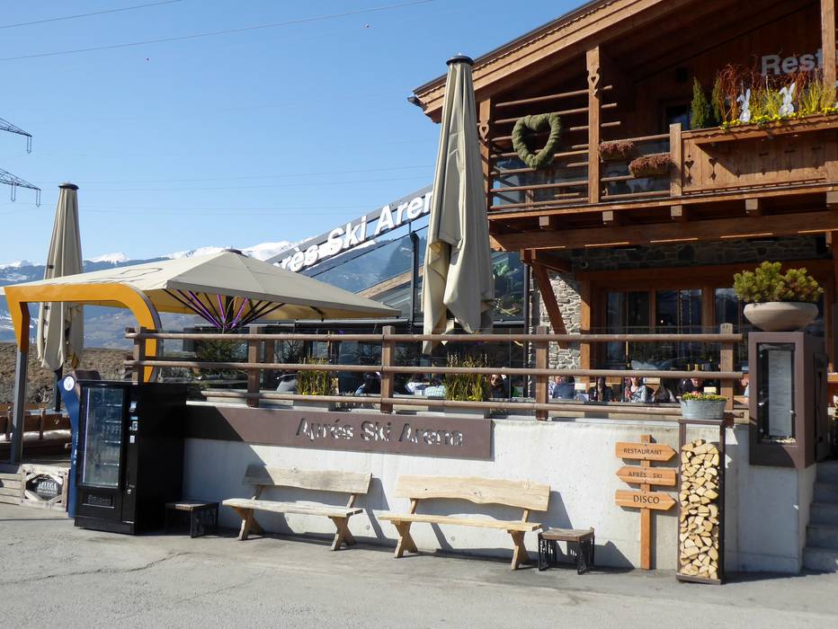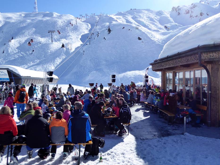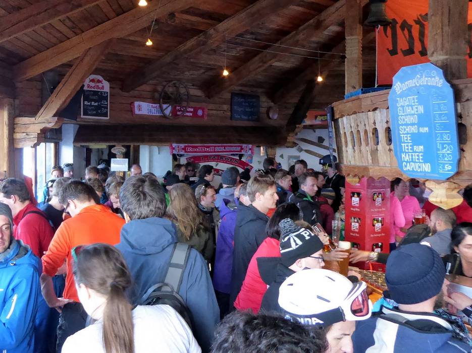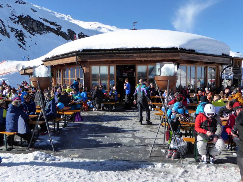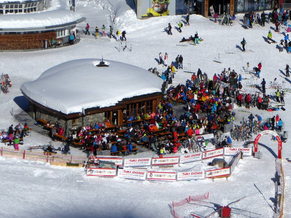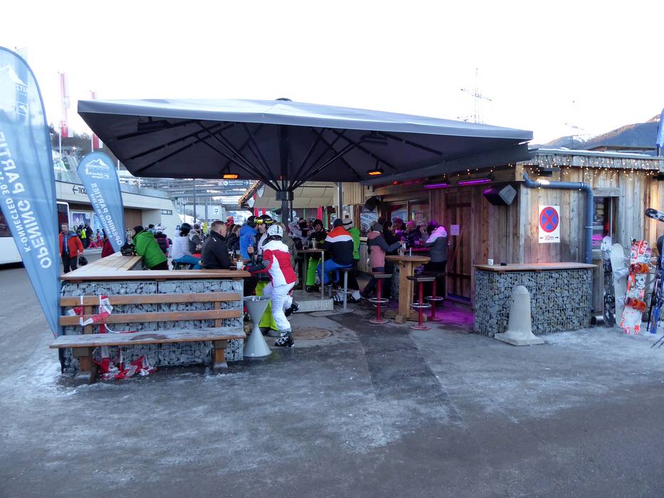 Bonne ambiance avec de la bonne musique jusqu'à la dernière descente. Le Parasol-Schirmbar est le point central de la grande terrasse orientée au sud devant l'Alpincenter.