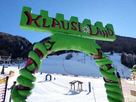 Le Klausberg est très adapté aux familles et aux enfants. Avec le Klausiland, le Klausberg-Flitzer, la Dino Fun-Line et une zone parfaite à l’Almboden, le domaine skiable propose de nombreuses attractions pour toute la famille. Les enfants jusqu’à 8 ans skient gratuitement et chaque forfait de ski inclut un trajet gratuit avec le Klausberg-Flitzer. Le Klausberg-Flitzer est une piste de luge sur rails (Alpine Coaster). Des cours de ski spéciaux pour enfants sont proposés et il existe également un nouveau jardin d’enfants de ski, unique en son genre dans le Tyrol du Sud. Celui-ci a été entièrement reconstruit en 2016 et offre, sur 250 m², tout ce dont rêvent les enfants.