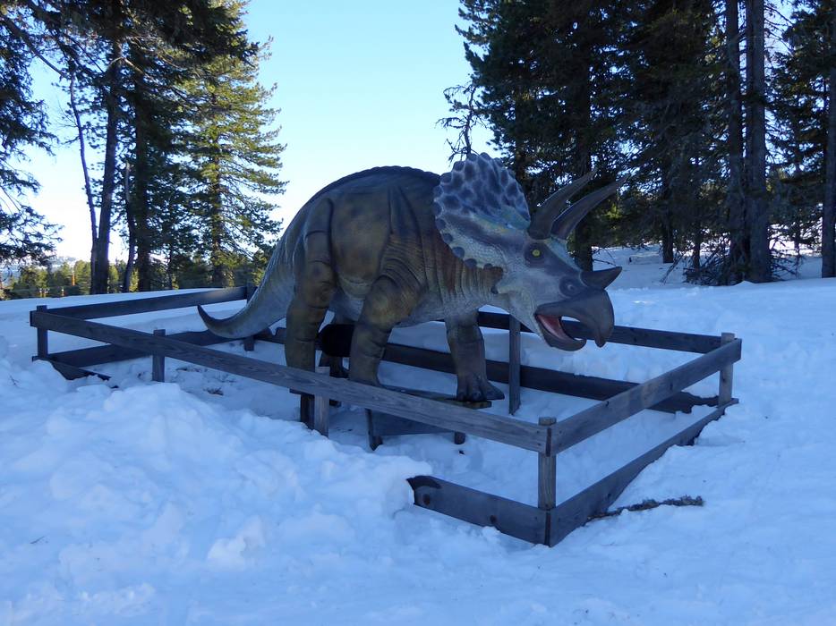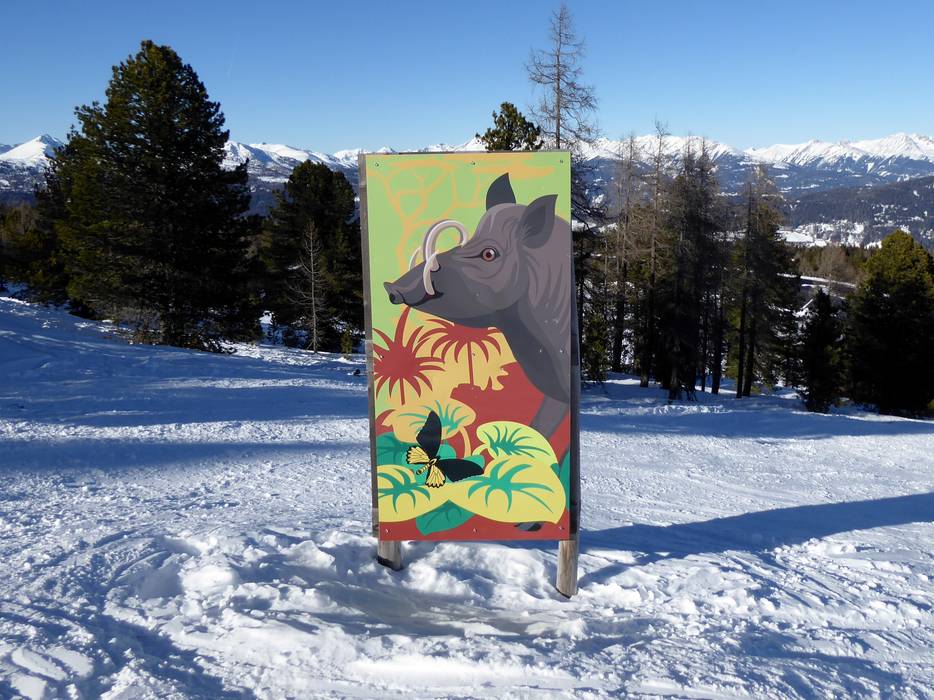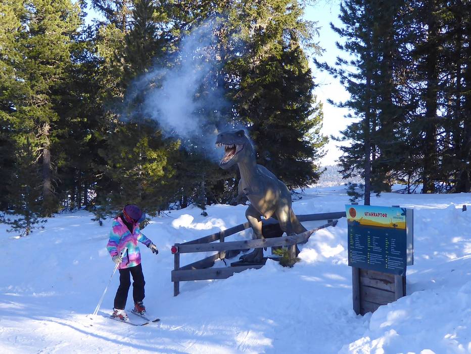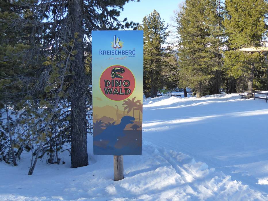 Au téléski Kreischi, de gentils dinosaures attendent dans la forêt de pins cembro.
