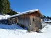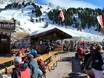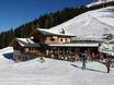 Le chalet de ski convivial avec une grande terrasse ensoleillée propose des spécialités tyroliennes en libre-service.
