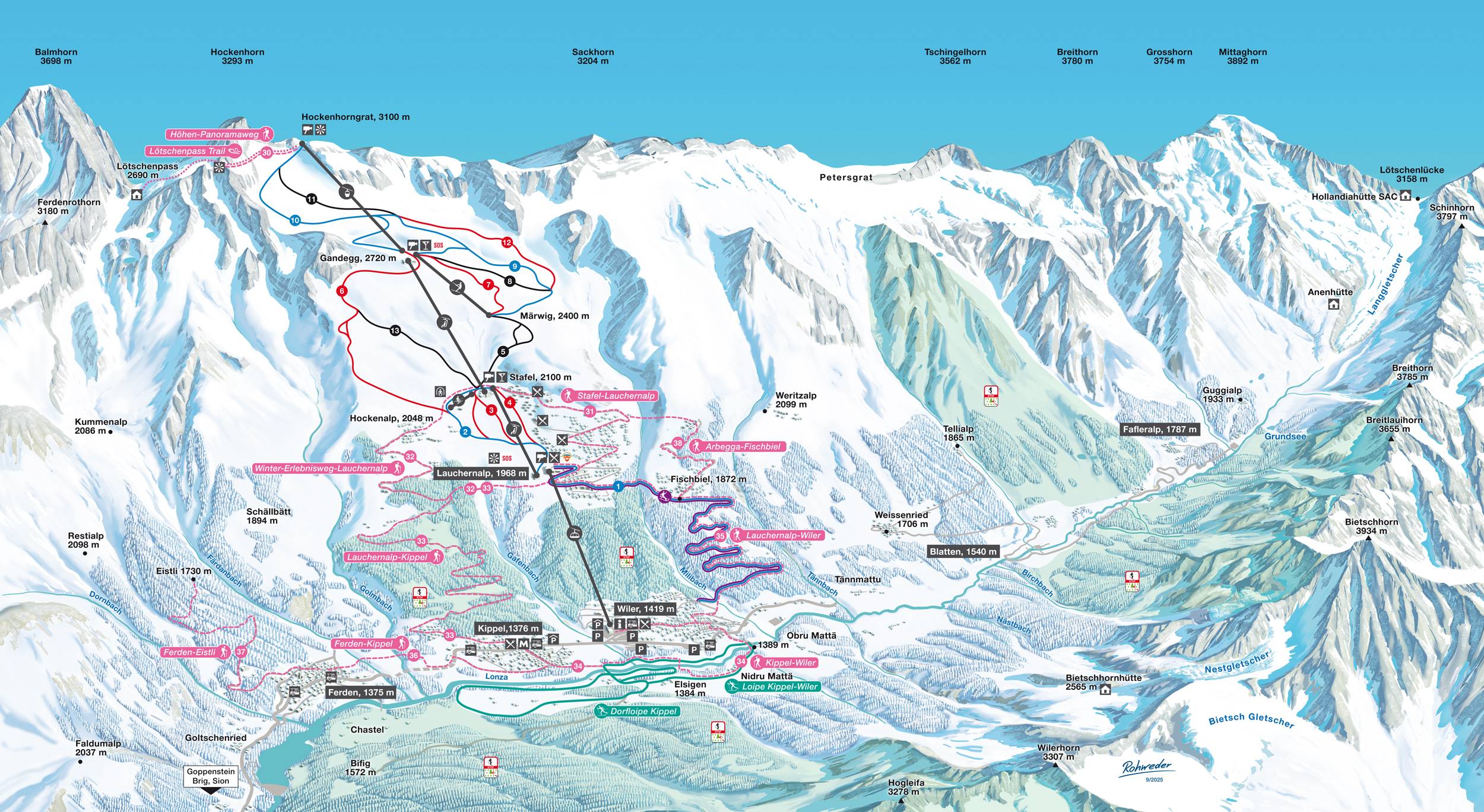 Indications de directions (plans, panneaux informatifs, signalisation) et sécurité sur le domaine skiable Lauchernalp – Lötschental