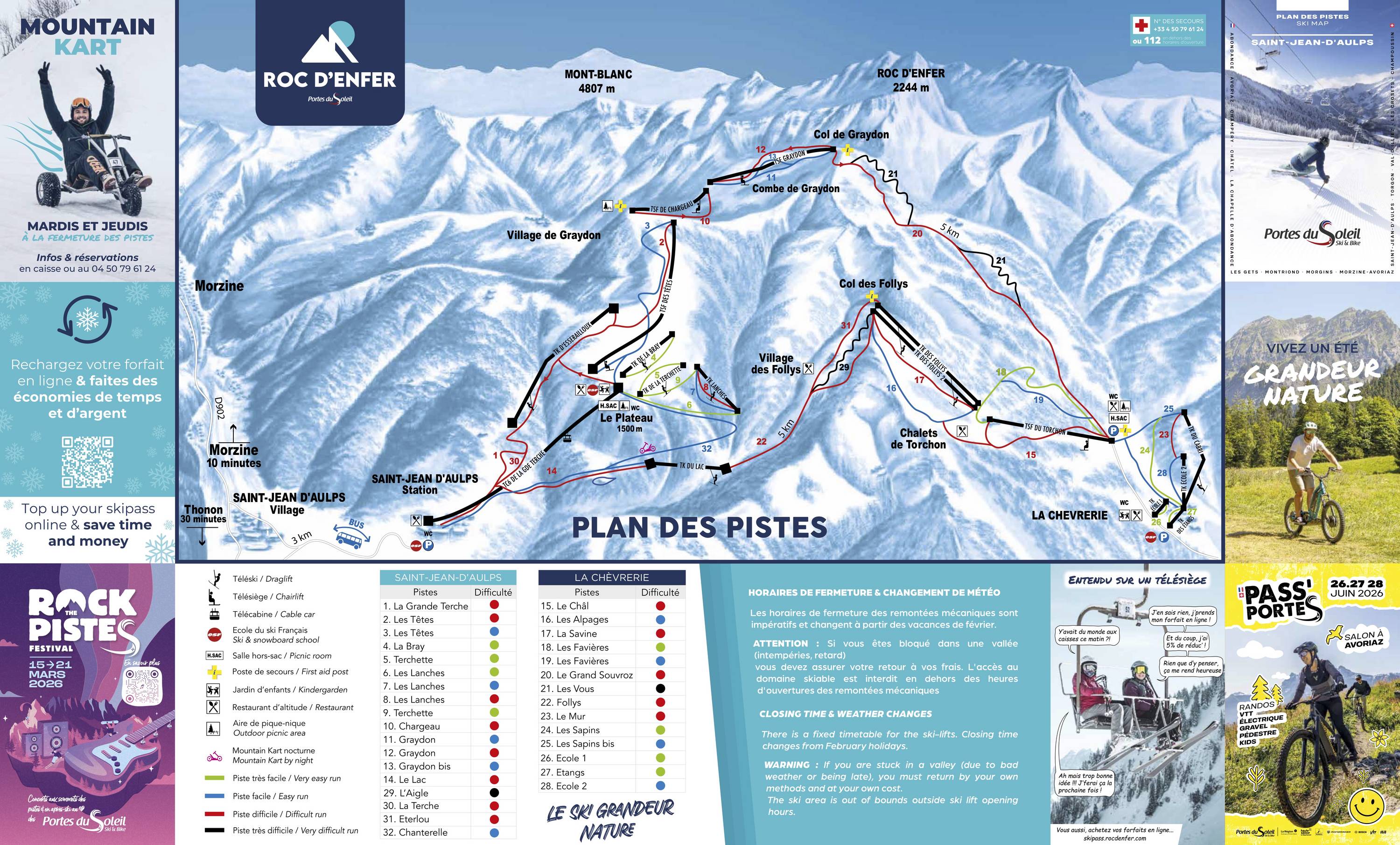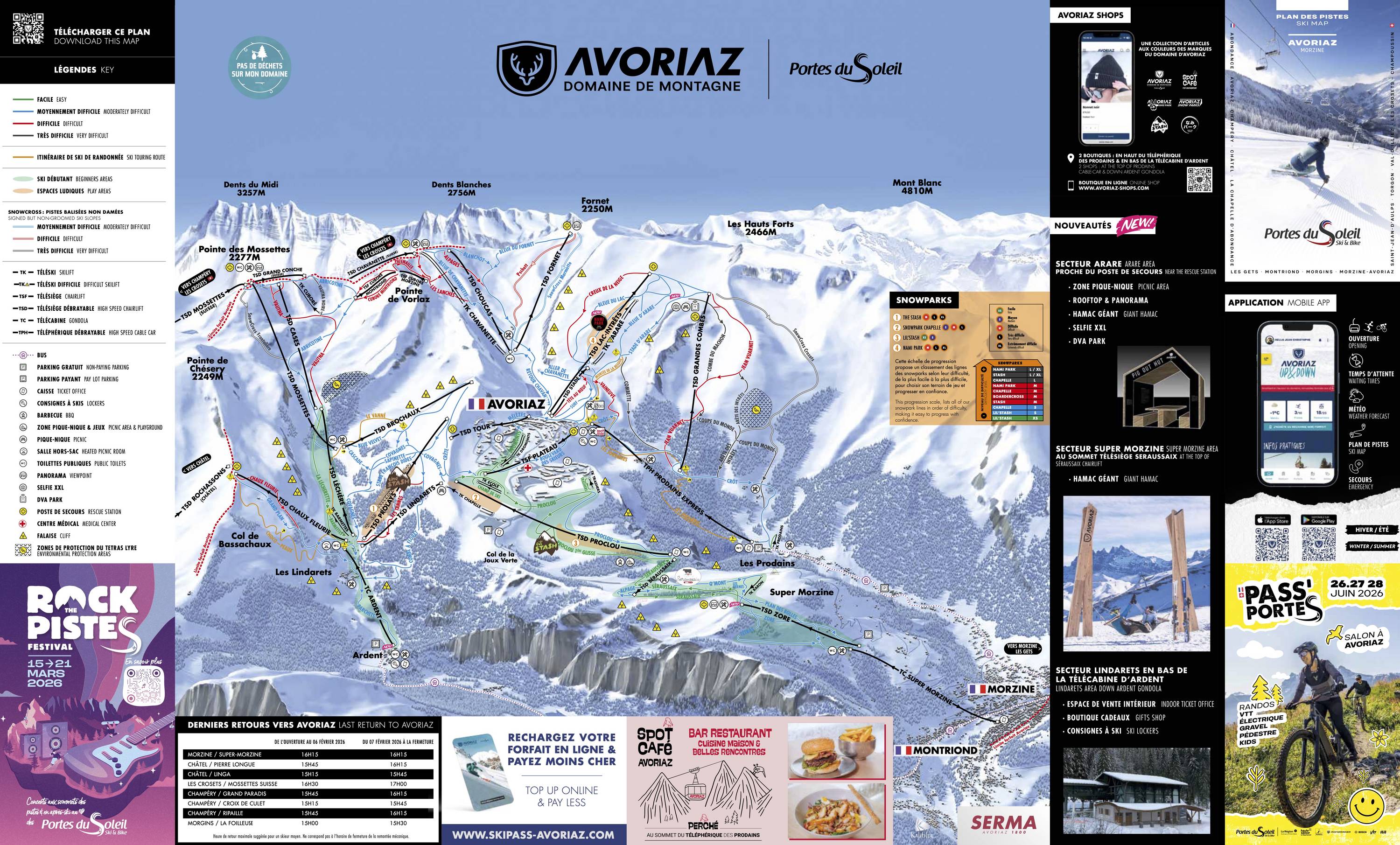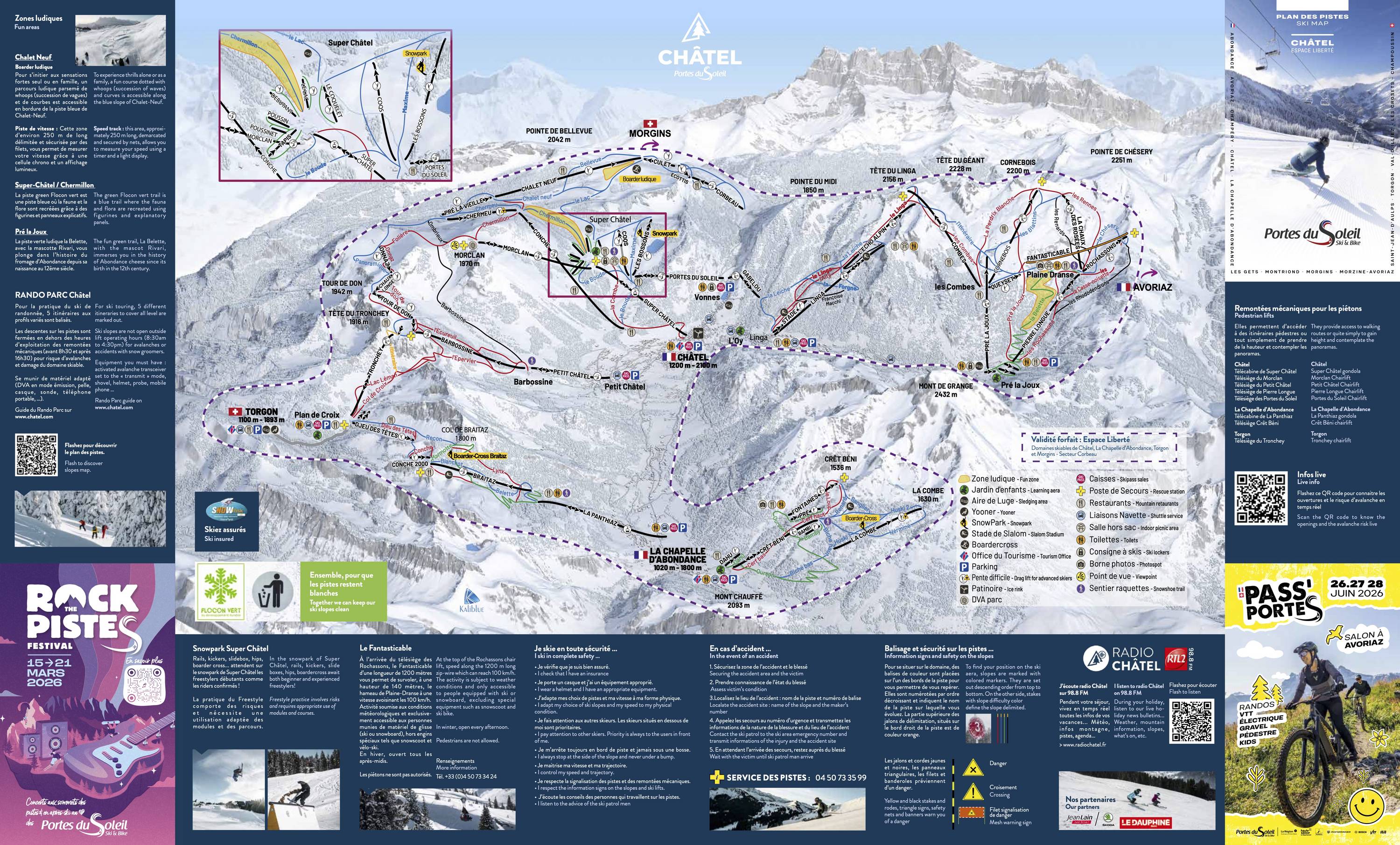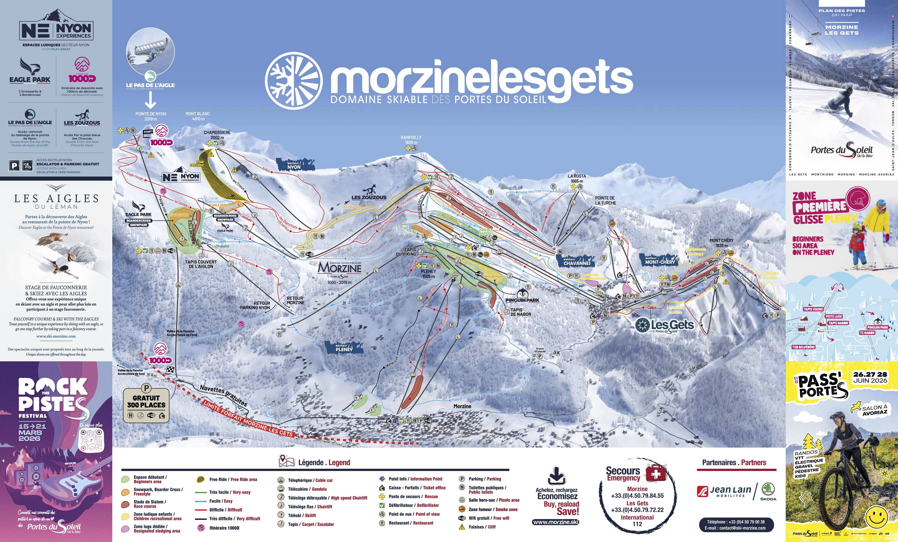 Le plan des pistes représente l'ensemble du domaine skiable des Portes du Soleil. Cependant, l'écriture est très petite, mais on peut bien reconnaître les connexions. Les noms des descentes ne sont pas indiqués. Les remontées mécaniques pourraient être mieux décrites et, malheureusement, les possibilités de restauration ne sont pas indiquées. Au verso du plan des pistes se trouve généralement un plan détaillé de l'endroit où l'on a pris le plan. On y trouve alors des informations plus précises.